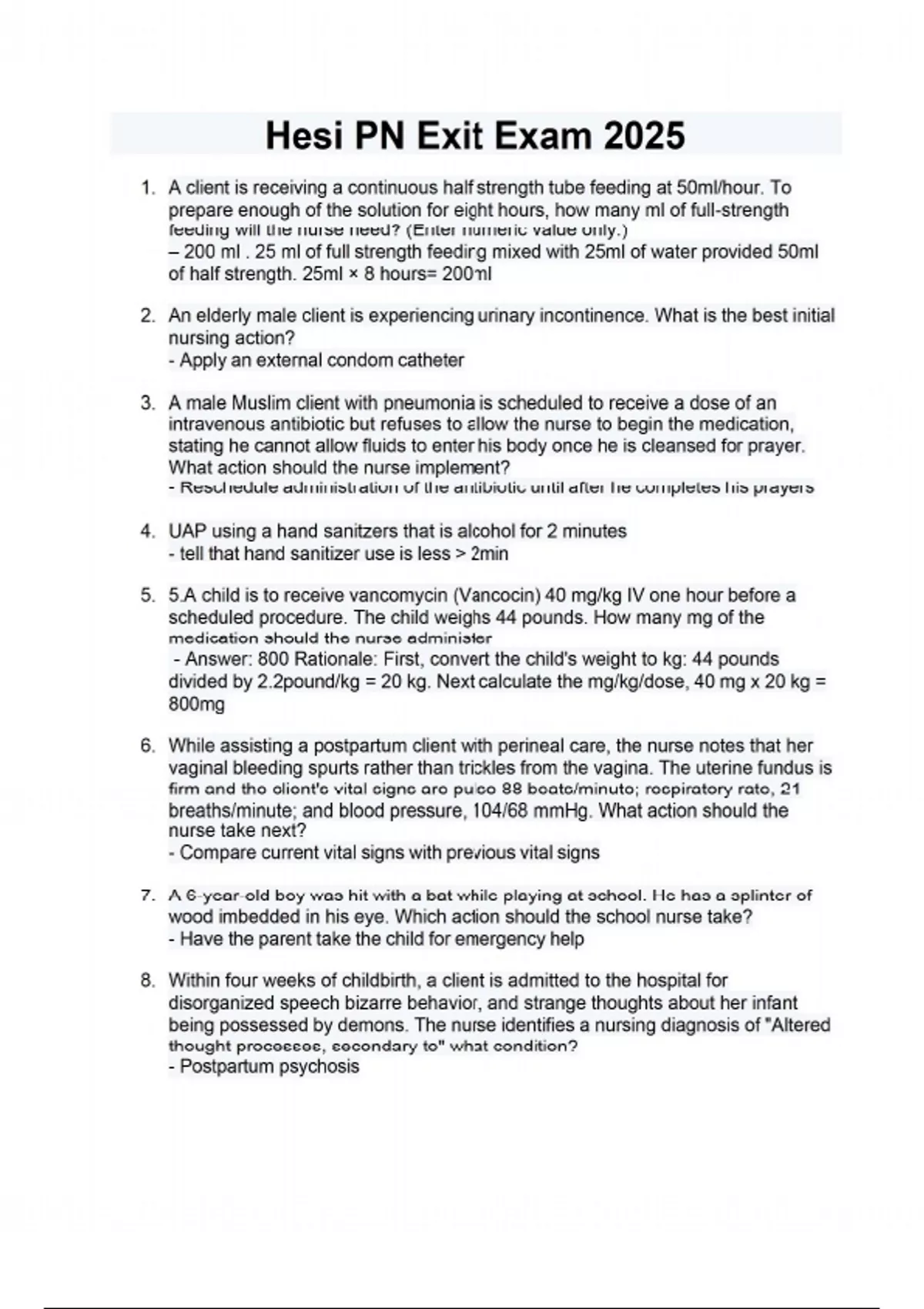 1. A client is receiving a continuous half strength tube feeding at 50ml/hour. To prepare enough of the solution for eight hours, how many ml of full-strength feeding will the nurse need? (Enter numeric value only.) – 200 ml . 25 ml of full strength feeding mixed with 25ml of water provided 50ml of half strength. 25ml × 8 hours= 200ml 2. An elderly male client is experiencing urinary incontinence. What is the best initial nursing action? - Apply an external condom catheter 3. A male Muslim client with pneumonia is scheduled to receive a dose of an intravenous antibiotic but refuses to allow the nurse to begin the medication, stating he cannot allow fluids to enter his body once he is cleansed for prayer. What action should the nurse implement? - Reschedule administration of the antibiotic until after he completes his prayers 4. UAP using a hand sanitzers that is alcohol for 2 minutes - tell that hand sanitizer use is less > 2min 5. 5.A child is to receive vancomycin (Vancocin) 40 mg/kg IV one hour before a scheduled procedure. The child weighs 44 pounds. How many mg of the medication should the nurse administer - Answer: 800 Rationale: First, convert the child's weight to kg: 44 pounds divided by 2.2pound/kg = 20 kg. Next calculate the mg/kg/dose, 40 mg x 20 kg = 800mg 6. While assisting a postpartum client with perineal care, the nurse notes that her vaginal bleeding spurts rather than trickles from the vagina. The uterine fundus is firm and the client's vital signs are pulse 88 beats/minute; respiratory rate, 21 breaths/minute; and blood pressure, 104/68 mmHg. What action should the nurse take next? - Compare current vital signs with previous vital signs 7. A 6-year-old boy was hit with a bat while playing at school. He has a splinter of wood imbedded in his eye. Which action should the school nurse take? - Have the parent take the child for emergency help 8. Within four weeks of childbirth, a client is admitted to the hospital for disorganized speech bizarre behavior, and strange thoughts about her infant being possessed by demons. The nurse identifies a nursing diagnosis of "Altered thought processes, secondary to" what condition? - Postpartum psychosis 9. The nurse identifies a priority diagnosis of, "Altered comfort related to menstrual cramps" for a 25-year-old female client. Which self-care activity should the nurse emphasize in the client's teaching plan? - Regular aerobic exercise. 10. Psych/Alcohol/Tylenol overdose antidote - Give Mucomyst 11. Medical Surgical/Laxative abuses - Patient -taking Milk of Magnesium 12. Spiritual/Documentation - Native American - Allow pt's family to stay in the room 13. Leadership- Interpreter informed consent - Pt should sign the consent 14. Geriatrics/Emergency Rib fractures fall - Pulmonary embolism 15. A client diagnosed with major depression is being allowed a weekend pass from the psychiatric unit. Which instruction should the nurse provide to the client's family? - Involve the client in usual at home activities 16. Upon assessment, the nurse discovers that a postpartum client has persistent red lochia. Which of the following does this assessment finding suggest to the nurse? - Coagulation disorders 17. The healthcare provider performs peritoneal dialysis on a client, after which 2 liters of fluid is drained. What action should the nurse complete first? - Assess vital signs. 18. After administering a medication through a nasogastric tube connected to suction, what action should the nurse take first? - Clamp the tube 19. The nurse is caring for four clients: Client A 94% o2 saturation, Client B, hemoglobin of 8.; Client C, potassium level of 3.8 and Client D appendectomy who has a white blood cell count of 15,000. What should the nurse implement? - Determine if Client B has two units of packed cells available in the blood bank. 20. Triage question with a train wreck the psychiatric nurse is called to a train derailment that was likely caused by a terrorist bomb. In triaging those in need of immediate care, what is the priority ranking for these cases? (arrange these cases in order or priority with the top item requiring the most immediate care and the bottom item requiring the least priority care) - A mother and father have just arrived on the. A crying child being held by another passenger. A woman sitting on the ground with a blanket. A middle-aged man who is wandering around (arrange in order) = middle age woman bleeding- woman w/ blanket- child crying- mother and father. (Mine didn't have a middle age woman bleeding, instead it had an old man wandering and - correct order is: wandering old man, woman w/blanket, man holding baby, and mother & father) 21. The nurse in the emergency department is using the simple triage and rapid transport (START) system to assess victims of a hurricane. Which statement correctly describes a yellow disaster tag? - A yellow disaster tag means critical injuries and require immediate intervention. 22. What makes a baby frontal bulge or rises - crying 23. Which of the following is a nursing intervention for a 3-year-old client who is going in for surgery in 8 hours that has an order for fluid restriction? - Do not allow the child to drink fluids 24. The ear, where do u pull to give a ear drop - it a picture so look it up online (KNOW CHILD & ADULT) (pull the pinnae top side of ear; u can look at a picture to see exactly where pinnae is) (Mine had a picture of ear and put it on the lobule of the pinnae it is the ear lobe). The eye picture asked to find the macula or the fovea centralis (there are 2 prominent spots on the eye - choose the DARK spot to the left not the spot where the light is) 25. Know your serum levels? – K- 3.5-5.1, Na - 135-145, Ca 9-11, BUN - 10-20 26. When to use drug for motion sickness drug question - Take Zofran 4 hours before going on trip via sea. 27. Pt with DM - she states that she has to eat lunch rite after the gets her insulin to prevent going to hypoglycemia 28. Electrical burn