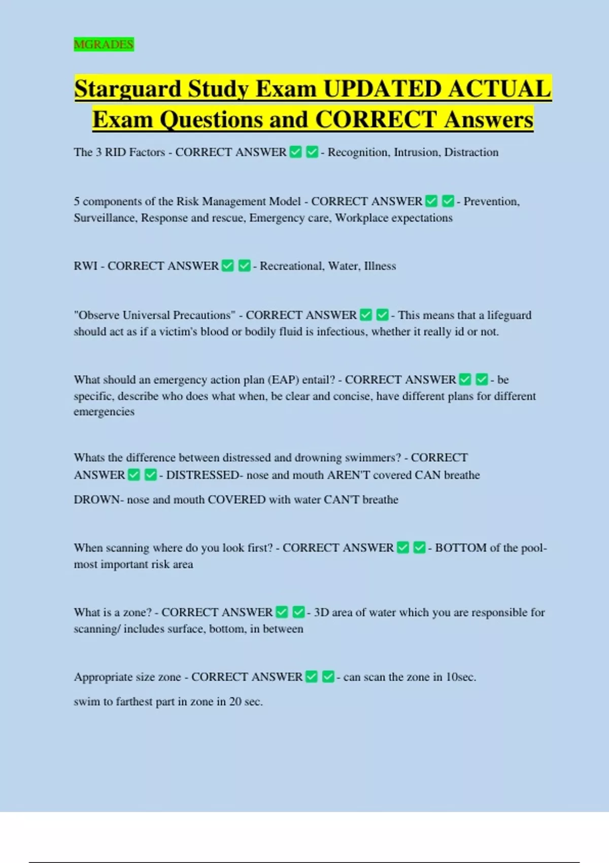 Starguard Study Exam UPDATED ACTUAL Exam Questions and CORRECT Answers The 3 RID Factors - CORRECT ANSWER - Recognition, Intrusion, Distraction 5 components of the Risk Management Model - CORRECT ANSWER Surveillance, Response and rescue, Emergency care, Workplace expectations RWI - CORRECT ANSWER - Recreational, Water, Illness "Observe Universal Precautions" - CORRECT ANSWER - Prevention, - This means that a lifeguard should act as if a victim's blood or bodily fluid is infectious, whether it really id or no