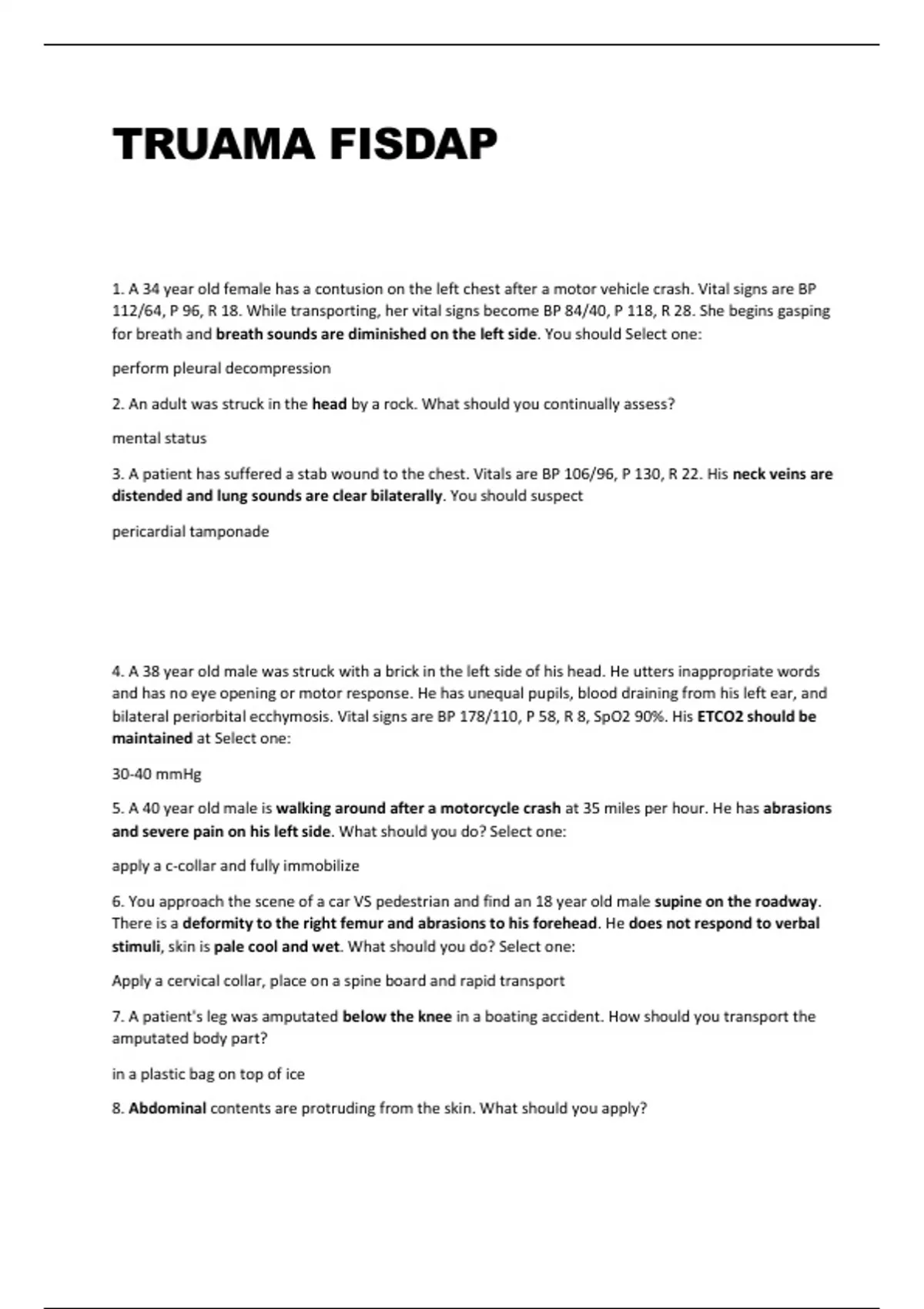 TRUAMA FISDAP Questions and Answers with Rationale