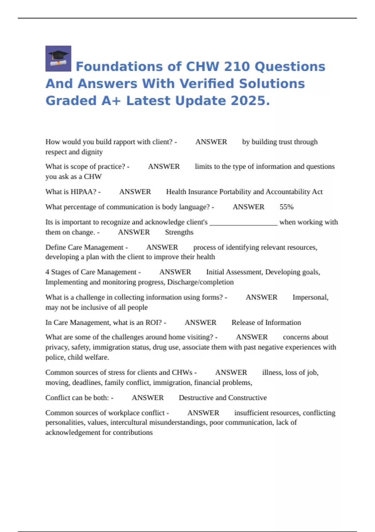 Foundations of CHW 210 Questions And Answers With Verified Solutions Graded A+ Latest Update 2025.