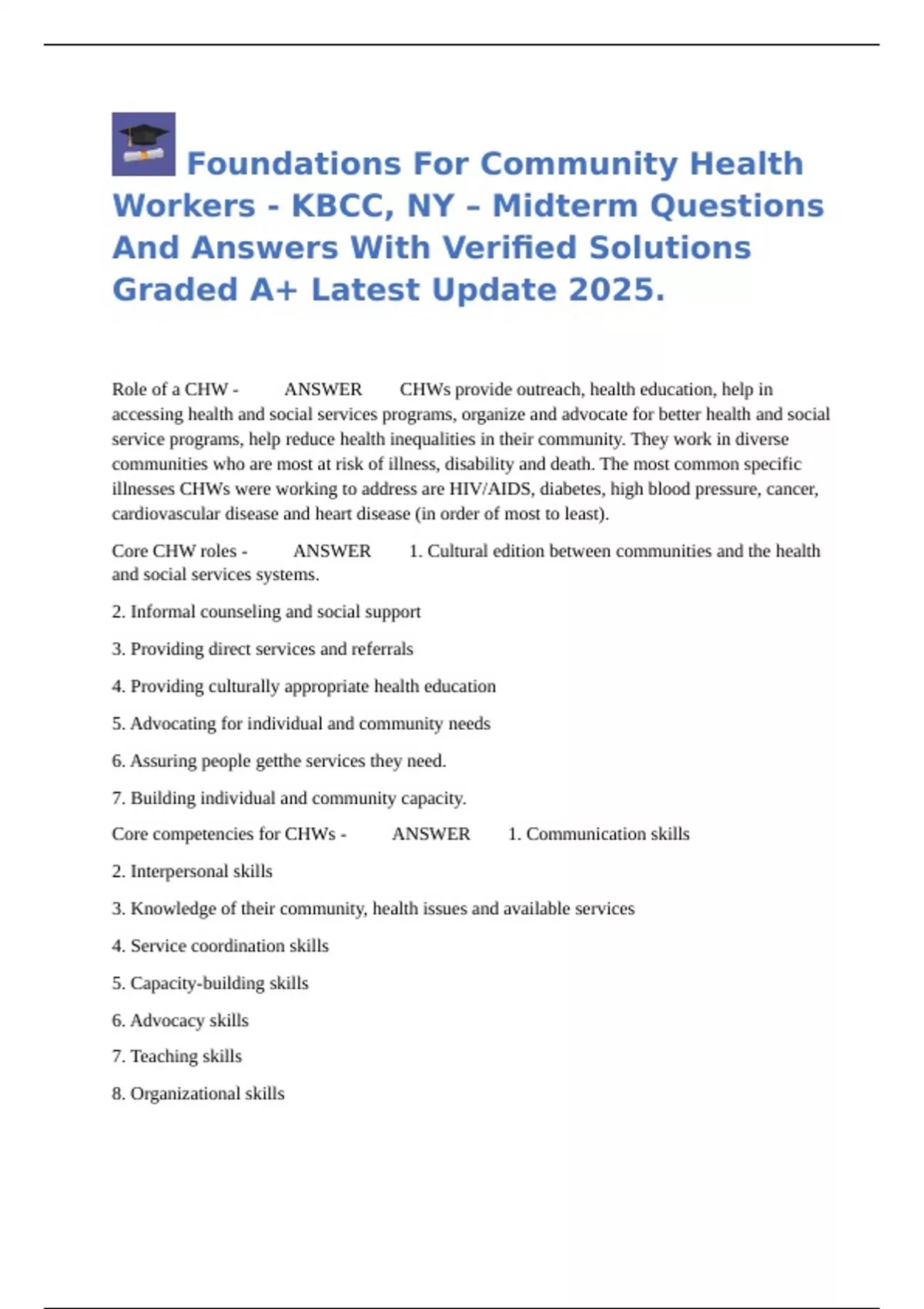 Foundations For Community Health Workers - KBCC, NY – Midterm Questions And Answers With Verified Solutions Graded A+ Latest Update 2025.