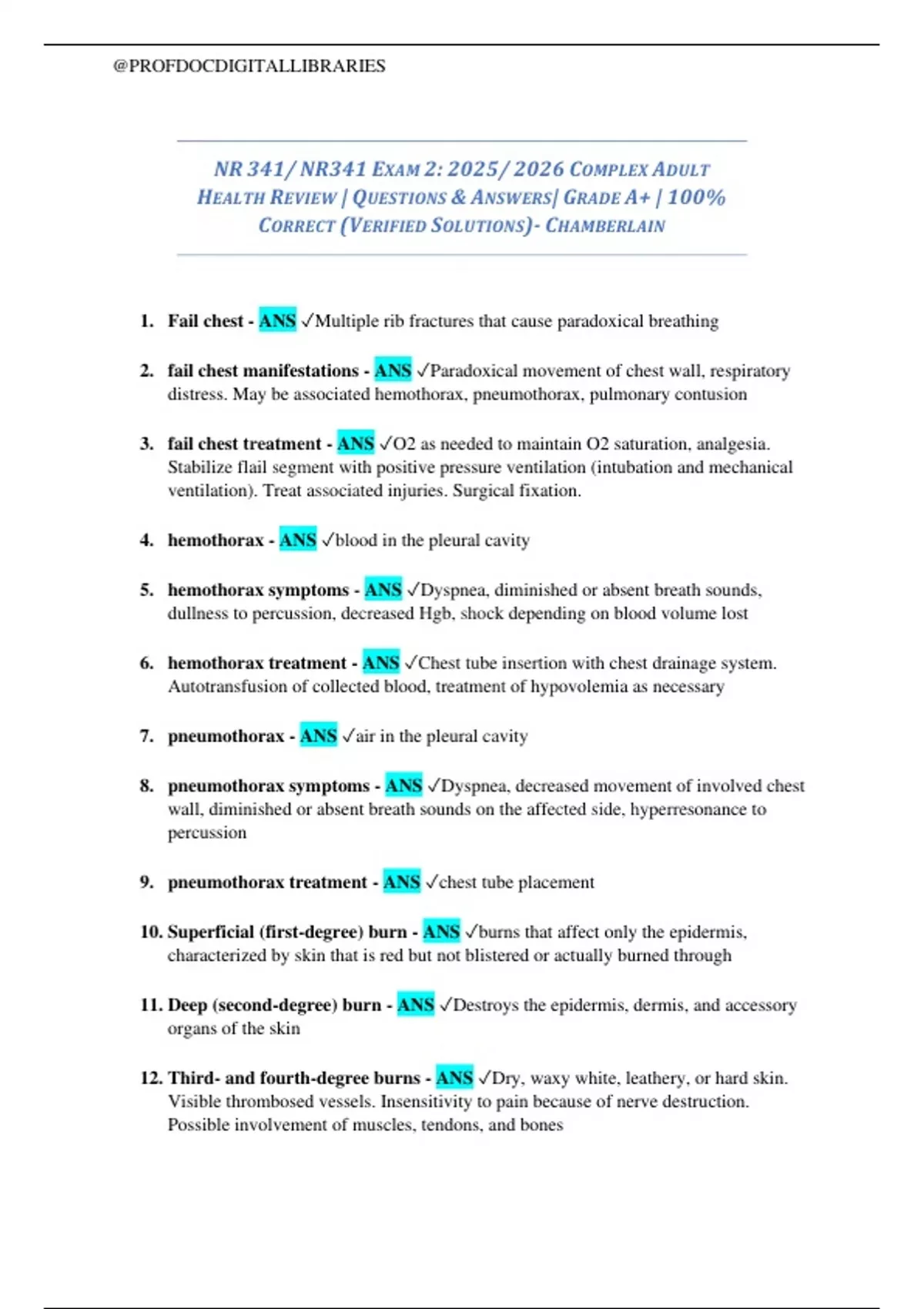 5. hemothorax symptoms - ANS ✓Dyspnea, diminished or absent breath sounds,