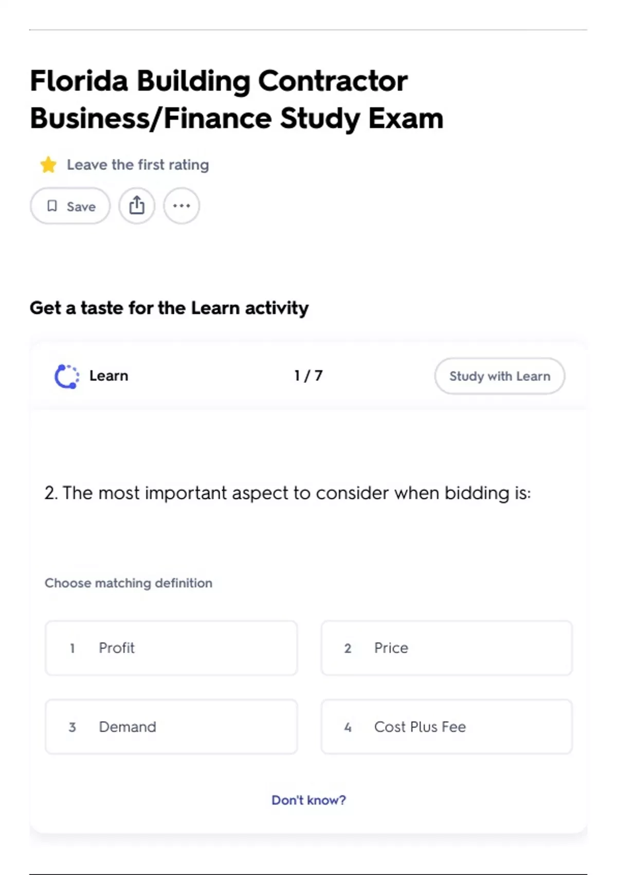 Florida Building Contractor Business/Finance Study Exam Leave the first rating Save Get a taste for the Learn activity Learn 1 / 7 Study with Learn 2. The most important aspect to consider when bidding is: Choose matching definition 1 Profit 3 Demand 2 Price 4 Cost Plus Fee Don't know? Terms in this set (100) 1. How many employees must an employer have before he must apply for workers compensation insurance? 1 or more 2. The most important aspect to consider when bidding is: Profit 3. What does the acronym GAAP signify in accounting? Generally Accepted Accounted Principles 4. If I fail one or more portions of the examination, do I have to retake all parts again? No, only the exams on which he or she failed to achieve a passing score 5. In order to obtain a building permit the following is required: Filling out an application 6. When can you allow your employee to view their personal file? Whenever they wish to 7. A payment bond would be posted by the: Prime contractor or property owner 8. How long after I pass the examinations do I have to apply for Initial Licensure? Four years