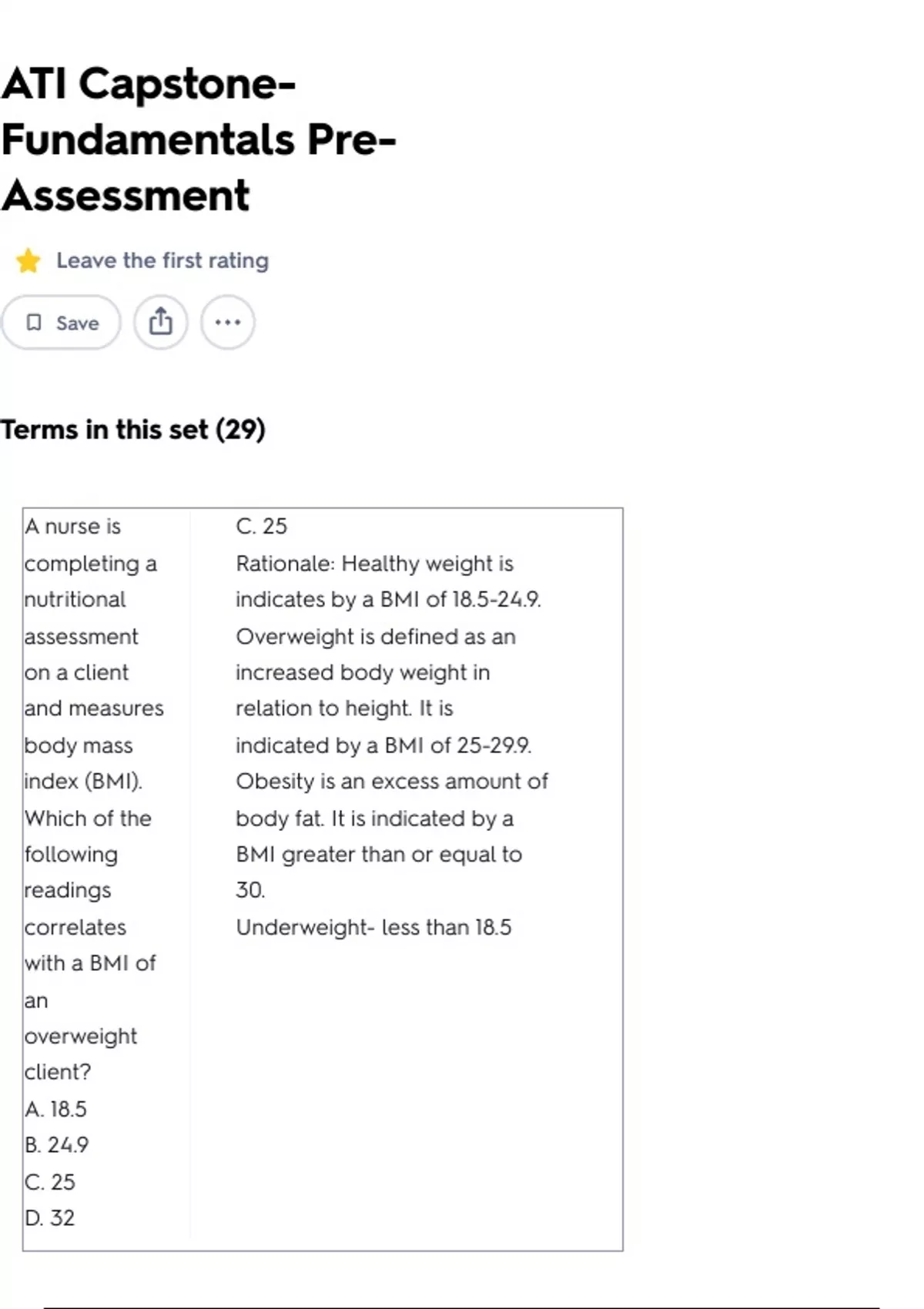 ATI Capstone Fundamentals Pre Assessment Leave the first rating Save Terms in this set (29) A nurse is completing a nutritional assessment on a client and measures body mass index (BMI). Which of the following readings correlates with a BMI of an overweight client? A. 18.5 B. 24.9 C. 25 D. 32 C. 25 Rationale: Healthy weight is indicates by a BMI of 18.5-24.9. Overweight is defined as an increased body weight in relation to height. It is indicated by a BMI of 25-29.9. Obesity is an excess amount of body fat. It is indicated by a BMI greater than or equal to 30. Underweight- less than 18.5 A nurse is verifying nasogastric tube placement by the pH of aspirated gastric fluid. Which of the following pH values provides a good indication of correct tube placement? A. 2 B. 5 C. 7 D. 9 A. 2 Rationale: A good indication of appropriate placement is obtaining gastric contents with a pH between 0 and 4. A nurse is caring for a client with a closed head injury. When pressure is applied to client's nail beds, the client's eyes open and adduction of the arms with flexion of the elbows and wrists is noted. The client also moans with stimulation. What is the client's Glascow Coma Score? A. 4 B. 7 C. 9 D. 10 B. 7 (comatose) Rationale: Eye Opening (ranges from 4-1) 4 = spontaneous 3 = to voice 2 = to pain 1 = none Verbal (ranges from 5-1) 5 = oriented 4 = confused 3 = inappropriate words 2 = incomprehensible sounds 1= none Motor (raged from 6-1) 6 = obeys command 5 = localizes pain 4 = withdraws 3 = flexion (decorticate posturing) 2 = extension (decerebrate posturing) 1 = none