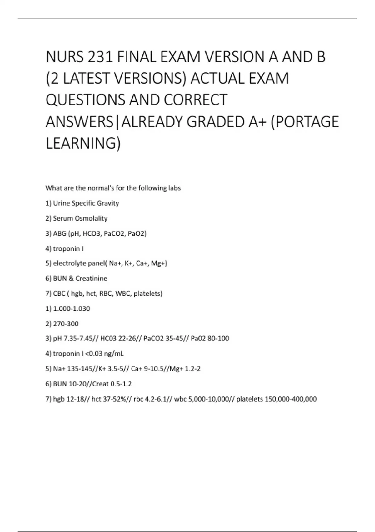 7) hgb 12-18// hct 37-52%// rbc 4.2-6.1// wbc 5,000-10,000// platelets 150,000-400,000