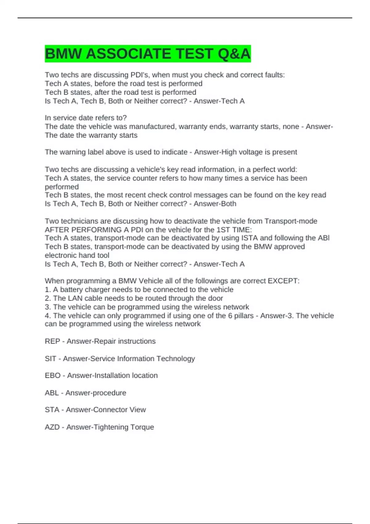 BMW ASSOCIATE TEST Q&A