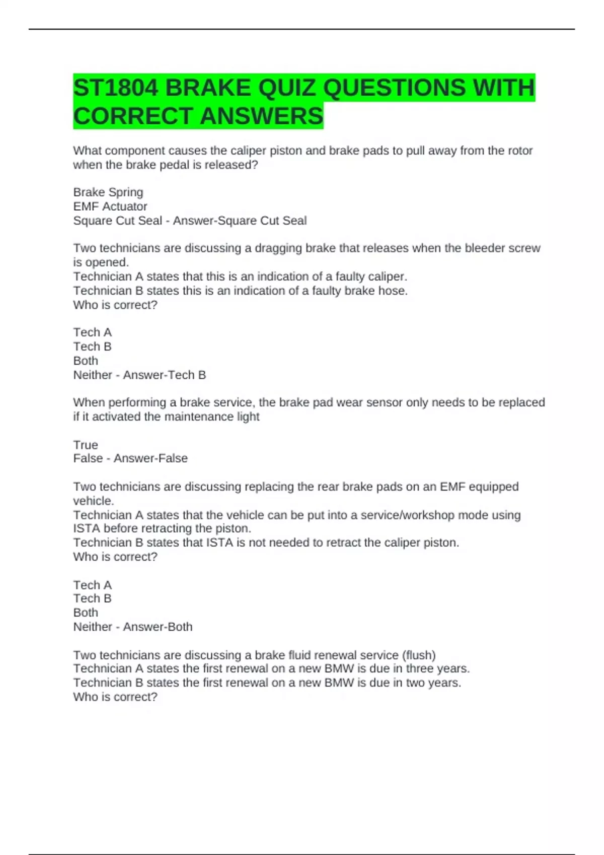 ST1804 BRAKE QUIZ QUESTIONS WITH CORRECT ANSWERS