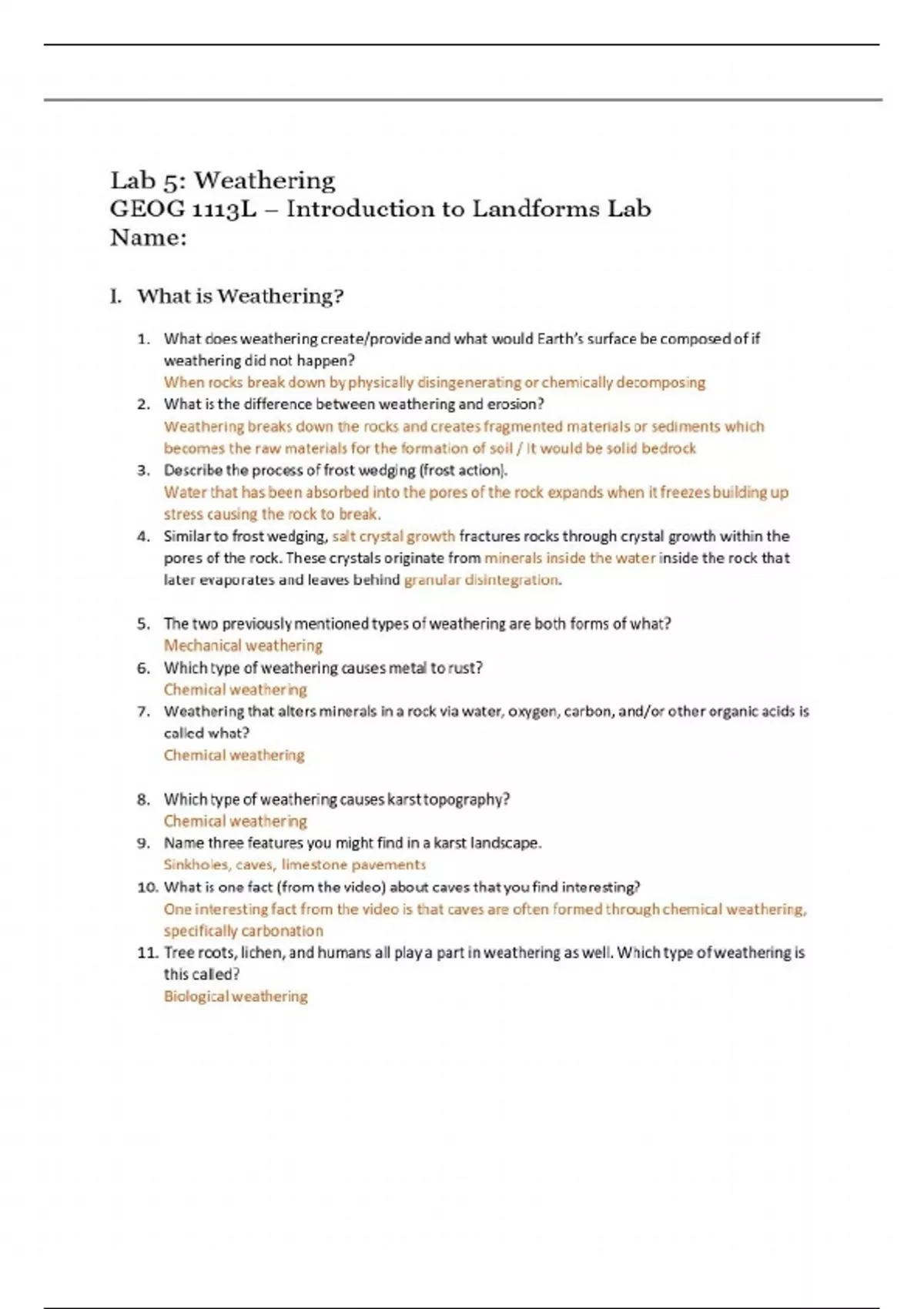GEOG 1113L Lab 5: Weathering | Questions and Answers | 2025 Update with complete solutions.