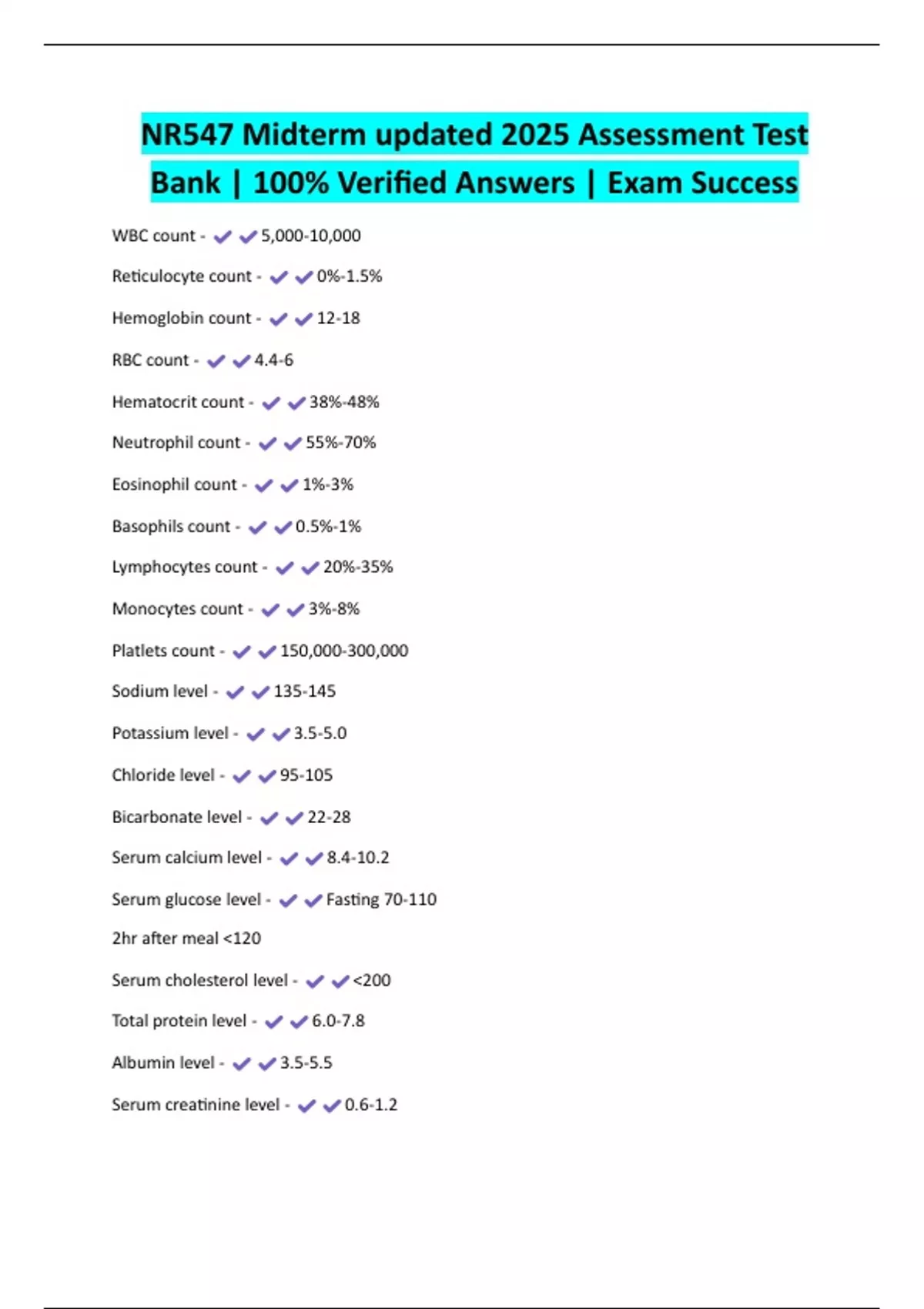 Serum creatinine level - 0.6-1.2