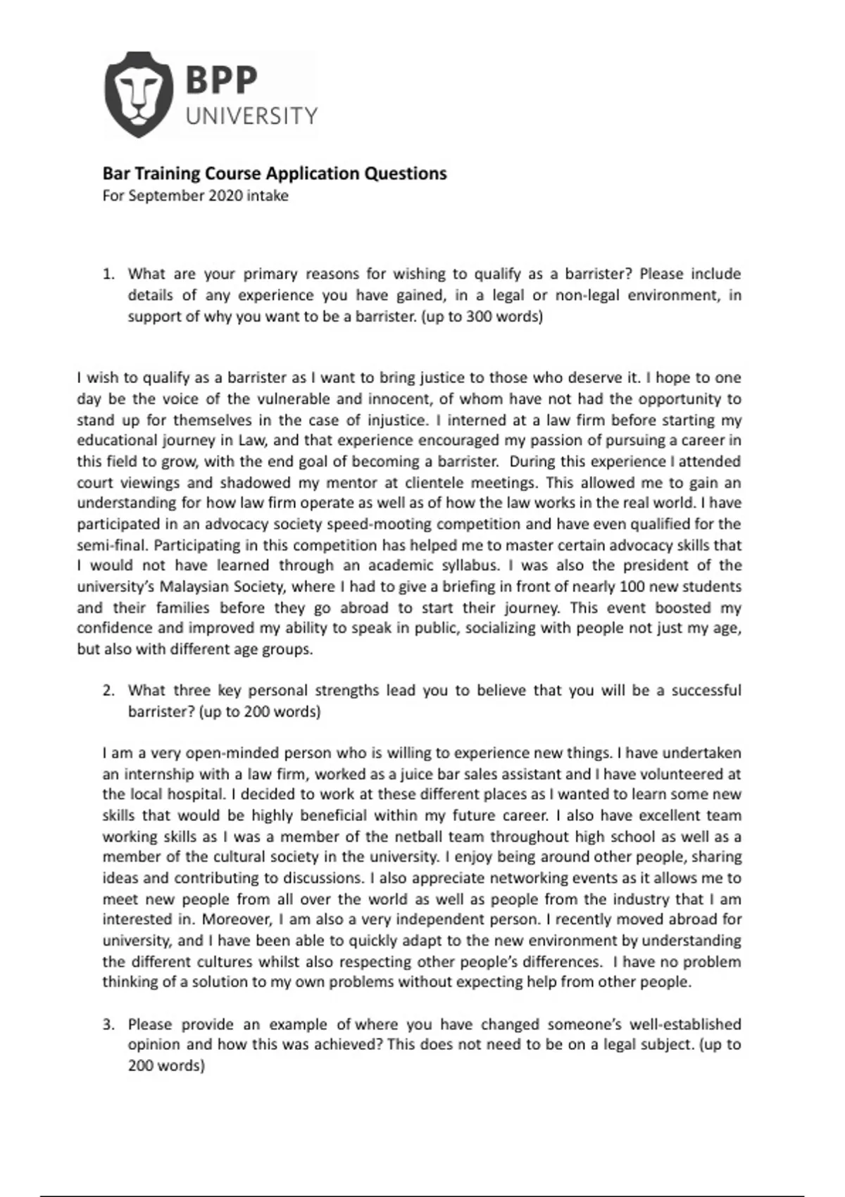 support of why you want to be a barrister. (up to 300 words)