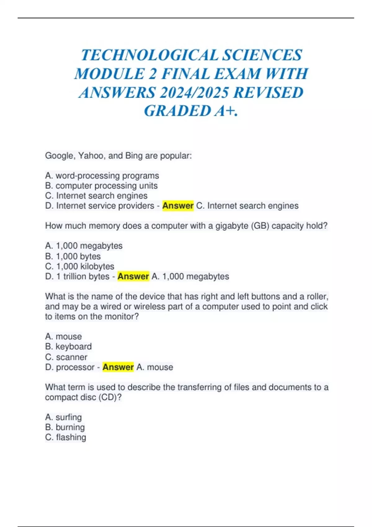 TECHNOLOGICAL SCIENCES MODULE 2 FINAL EXAM WITH ANSWERS 2024/2025 REVISED GRADED A+. Google, Yahoo, and Bing are popular: A. word-processing programs B. computer processing units C. Internet search engines D. Internet service providers - Answer C. Internet search engines How much memory does a computer with a gigabyte (GB) capacity hold? A. 1,000 megabytes B. 1,000 bytes C. 1,000 kilobytes D. 1 trillion bytes - Answer A. 1,000 megabytes What is the name of the device that has right and left buttons and a roller, and may be a wired or wireless part of a computer used to point and click to items on the monitor? A. mouse B. keyboard C. scanner D. processor - Answer A. mouse What term is used to describe the transferring of files and documents to a compact disc (CD)? A. surfing B. burning C. flashing D. etching - Answer B. burning The clarity of a computer monitor screen image is its: A. resistance B. resonance C. resignation D. resolution - Answer D. resolution What is the term for the small graphic symbols displayed on a monitor screen that represent computer files or programs that a user "clicks" on to open? A. avatar B. drive C. icon D. byte - Answer C. icon What is the term for the process of starting up when a computer is initially turned on? A. booting B. bolding C. browsing D. burning - Answer A. booting What is the name of the visual indicator represented by an arrow, blinking line, or hand that appears when the mouse is used to point to something on the screen? A. cursor B. character C. checker D. clicker - Answer A. cursor