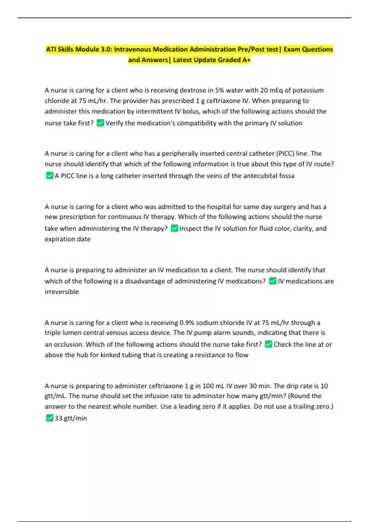 ATI Skills Module 3.0: Intravenous Medication Administration Pre/Post test| Exam Questions and Answers| Latest Update Graded A+