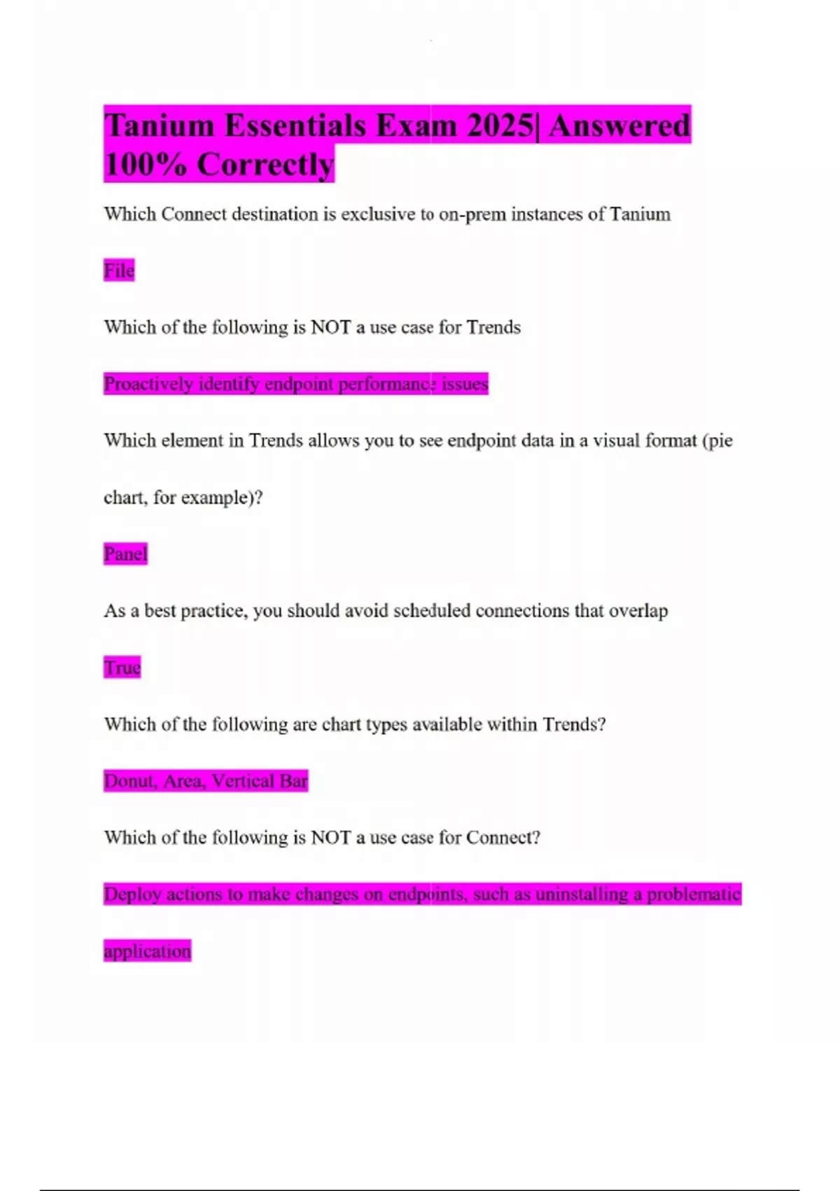 Tanium Essentials Exam 2025| Answered 100% Correctly Which Connect destination is exclusive to on-prem instances of Tanium File Which of the following is NOT a use case for Trends Proactively identify endpoint performance issues Which element in Trends allows you to see endpoint data in a visual format (pie chart, for example)? Panel As a best practice, you should avoid scheduled connections that overlap True Which of the following are chart types available within Trends? Donut, Area, Vertical Bar Which of the following is NOT a use case for Connect? Deploy actions to make changes on endpoints, such as uninstalling a problematic application Which of the following is NOT a use case for Enforce Detect endpoints with unsanctioned customer data What conditions must be defined when creating a Reveal rule? Pattern and Action Impact scores appear in Threat Response to help prioritize remediation for alerts