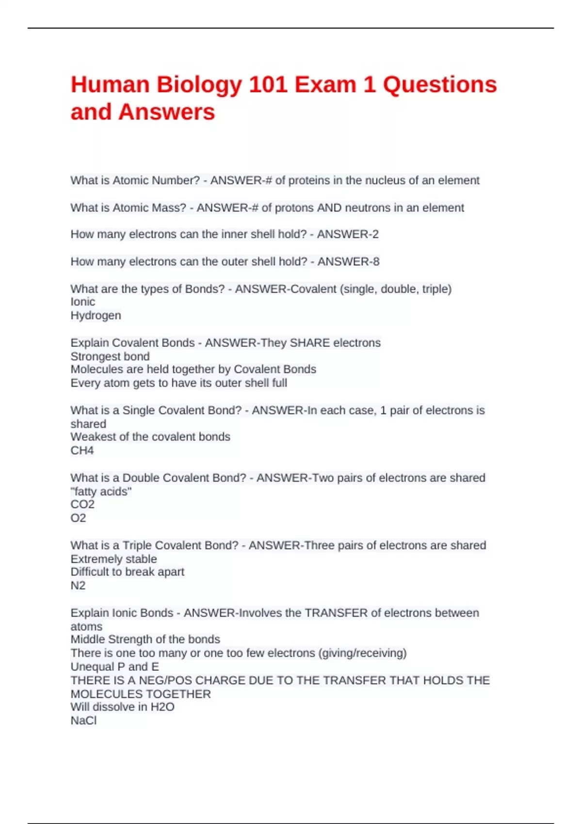 Human Biology 101 Exam 1 Questions