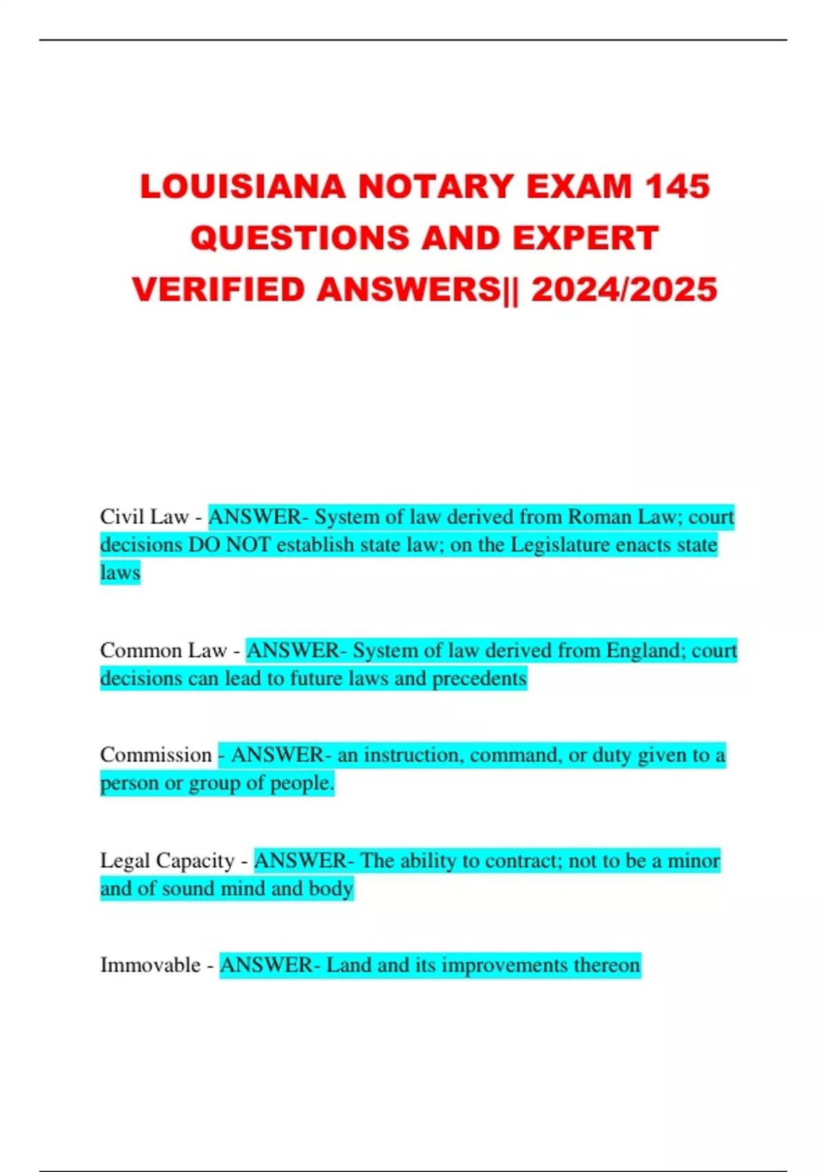 LOUISIANA NOTARY EXAM 145 QUESTIONS AND EXPERT VERIFIED ANSWERS|| 2024/2025LOUISIANA NOTARY EXAM 145 QUESTIONS AND EXPERT VERIFIED ANSWERS|| 2024/2025LOUISIANA NOTARY EXAM 145 QUESTIONS AND EXPERT VERIFIED ANSWERS|| 2024/2025