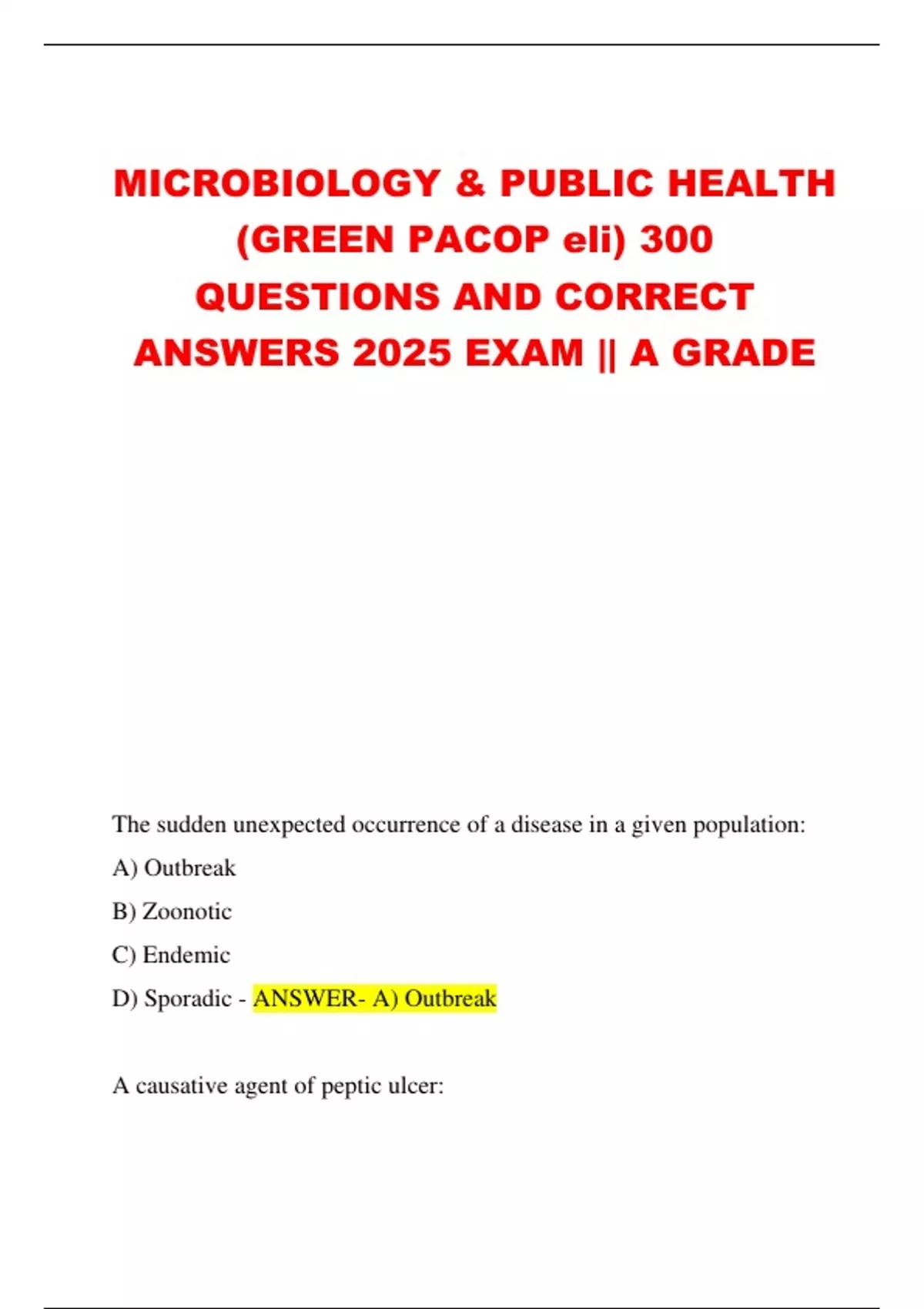 MICROBIOLOGY & PUBLIC HEALTH (GREEN PACOP eli) 300 QUESTIONS AND CORRECT ANSWERS 2025 EXAM || A GRADEMICROBIOLOGY & PUBLIC HEALTH (GREEN PACOP eli) 300 QUESTIONS AND CORRECT ANSWERS 2025 EXAM || A GRADEMICROBIOLOGY & PUBLIC HEALTH (GREEN PACOP eli) 300 QUESTIONS AND CORRECT ANSWERS 2025 EXAM || A GRADEMICROBIOLOGY & PUBLIC HEALTH (GREEN PACOP eli) 300 QUESTIONS AND CORRECT ANSWERS 2025 EXAM || A GRADEMICROBIOLOGY & PUBLIC HEALTH (GREEN PACOP eli) 300 QUESTIONS AND CORRECT ANSWERS 2025 EXAM || A GRADE