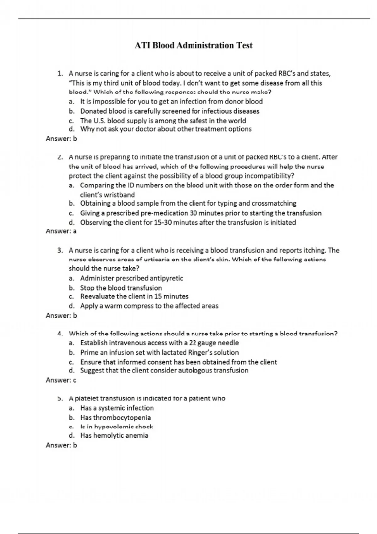 1. A nurse is caring for a client who is about to receive a unit of packed RBC’s and states, “This is my third unit of blood today. I don’t want to get some disease from all this blood.” Which of the following responses should the nurse make? a. It is impossible for you to get an infection from donor blood b. Donated blood is carefully screened for infectious diseases c. The U.S. blood supply is among the safest in the world d. Why not ask your doctor about other treatment options Answer: b 2. A nurse is preparing to initiate the transfusion of a unit of packed RBC’s to a client. After the unit of blood has arrived, which of the following procedures will help the nurse protect the client against the possibility of a blood group incompatibility? a. Comparing the ID numbers on the blood unit with those on the order form and the client’s wristband b. Obtaining a blood sample from the client for typing and crossmatching c. Giving a prescribed pre-medication 30 minutes prior to starting the transfusion d. Observing the client for 15-30 minutes after the transfusion is initiated Answer: a 3. A nurse is caring for a client who is receiving a blood transfusion and reports itching. The nurse observes areas of urticaria on the client’s skin. Which of the following actions should the nurse take? a. Administer prescribed antipyretic b. Stop the blood transfusion c. Reevaluate the client in 15 minutes d. Apply a warm compress to the affected areas Answer: b 4. Which of the following actions should a nurse take prior to starting a blood transfusion? a. Establish intravenous access with a 22 gauge needle b. Prime an infusion set with lactated Ringer’s solution c. Ensure that informed consent has been obtained from the client d. Suggest that the client consider autologous transfusion Answer: c 5. A platelet transfusion is indicated for a patient who a. Has a systemic infection b. Has thrombocytopenia c. Is in hypovolemic shock d. Has hemolytic anemia Answer: b 6. A nurse is preparing a blood transfusion for a client who has type A blood. The nurse should know that the client can safely receive blood group O because a. Type O blood contains no A antigens b. Type A blood contains O antibodies c. Type O blood contains no A antibodies d. Type A blood contains O antigens Answer: a 7. A nurse started a transfusion of packed RBC’s for a client 1 hour ago. The client has suddenly developed shaking chills, muscle stiffness, and a temperature of 38.6 C (101.5 F). The client appears flushed and reports a headache and “nervousness.” The nurse should identify that the client has most likely developed which of the following types of transfusion reaction? A. Septic B. Acute hemolytic C. Allergic D. Febrile nonhemolytic Answer: d 8. When administering a transfusion of packed red blood cells, it is important to a. Allow the blood to warm to room temperature for 1 hour b. Make sure the entire unit is transfused within 4 hours c. Begin the blood transfusion at a rate of 10 mL/hr d. Change the blood tubing after every unit infused Answer: b 9. A nurse is providing education to a client who has a prescription for a blood transfusion. Which of the following statements should the nurse include in the teaching? a. I will check your vital signs every 15 minutes throughout the blood transfusion b. I might have a nursing assistant check on you periodically during the transfusion c. If you have no adverse effects in the first 15-30 minutes, you will not have any adverse effects later d. You must immediately report any symptoms like chills, nausea, or itching Answer: d 10. A client who is anticipating total hip replacement is considering autologous transfusion. When teaching this client about autologous transfusion, it is important to emphasize that a. It reduces the risk of mismatched blood b. A hemoglobin level about 9.5 mg/dL is required to receive this transfusion c. There is no need to test the blood for infectious diseases d. Donations can be made every other day Answer: a