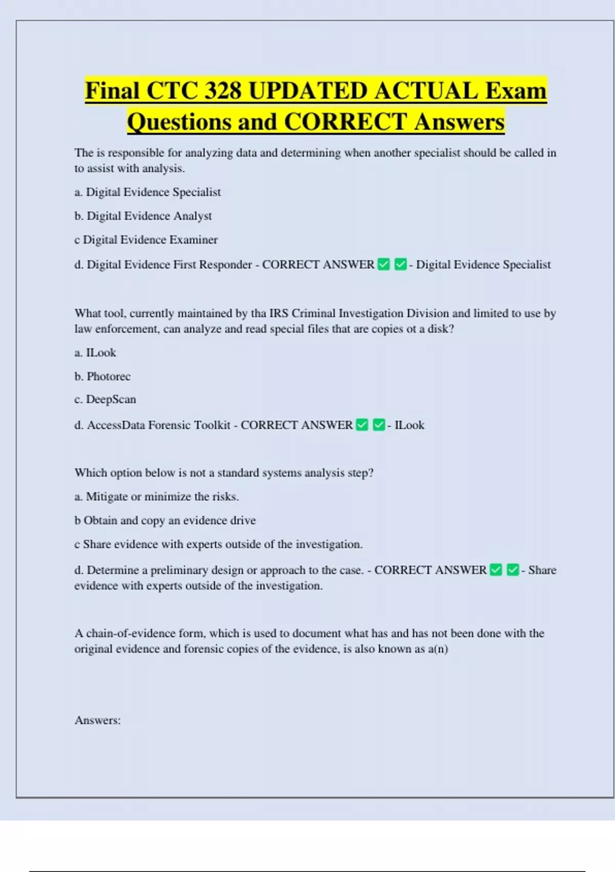 Final CTC 328 UPDATED ACTUAL Exam Questions and CORRECT Answers The is responsible for analyzing data and determining when another specialist should be called in to assist with analysis. a. Digital Evidence Specialist b. Digital Evidence Analyst c Digital Evidence Examiner d. Digital Evidence First Responder - CORRECT ANSWER - Digital Evidence Specialist What tool, currently maintained by tha IRS Criminal Investigation Division and limited to use by law enforcement, can analyze and read special files that are copies ot a disk?