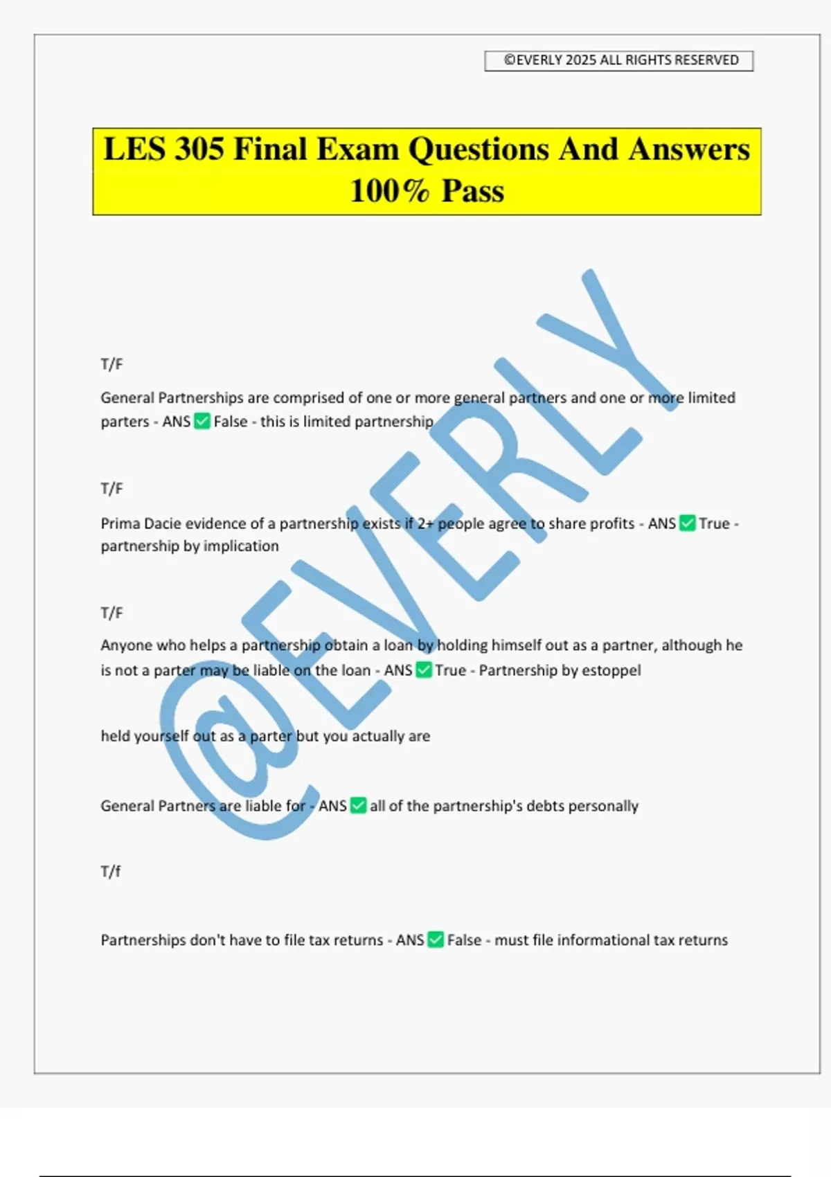 LES 305 Final Exam Questions And Answers 100% Pass T/F General Partnerships are comprised of one or more general partners and one or more limited parters - ANS False - this is limited partnership T/F Prima Dacie evidence of a partnership exists if 2+ people agree to share profits - ANS True - partnership by implication T/F Anyone who helps a partnership obtain a loan by holding himself out as a partner, although he is not a parter may be liable on the loan - ANS True - Partnership by estoppel held yourself out as a parter but you actually are General Partners are liable for - ANS all of the partnership's debts personally T/f Partnerships don't have to file tax returns - ANS False - must file informational tax returns ©EVERLY 2025 ALL RIGHTS RESERVED T/F each partner may bind a partnership to contracts w 3rd party - ANS true T/F if partnership dies, the partnership property that belonged to dead partner goes to the partner's estate - ANS False - only the value of the partners interest goes to the estate T/F when one partner dies, the partnership is automatically dissolved by law - ANS True Dissolution occurs by operation of law at the death of a partner. T/F Limited partners may manage the business and retain limited liability protection - ANS False if you engage in management as a limited partner, you are no liable for Corp. debts T/F If limited Partnership interests are easily transferable, the org may be treated as a corp by the IRS - ANS True - if you act like a corp, you will be taxed like a corp T/F Intel was incorporated in Delaware. It is a doestic corporation when it does business in AZ. - ANS False - its a domes