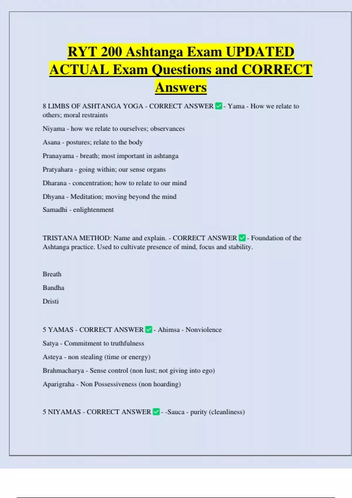RYT 200 Ashtanga Exam UPDATED ACTUAL Exam Questions and CORRECT Answers 8 LIMBS OF ASHTANGA YOGA - CORRECT ANSWER - Yama - How we relate to others; moral restraints Niyama - how we relate to ourselves; observances Asana - postures; relate to the body Pranayama - breath; most important in ashtanga Pratyahara - going within; our sense organs Dharana - concentration; how to relate to our mind Dhyana - Meditation; moving beyond the mind Samadhi - enlightenment TRISTANA METHOD: Name and explain. - CORRECT ANSWER - Foundation of the