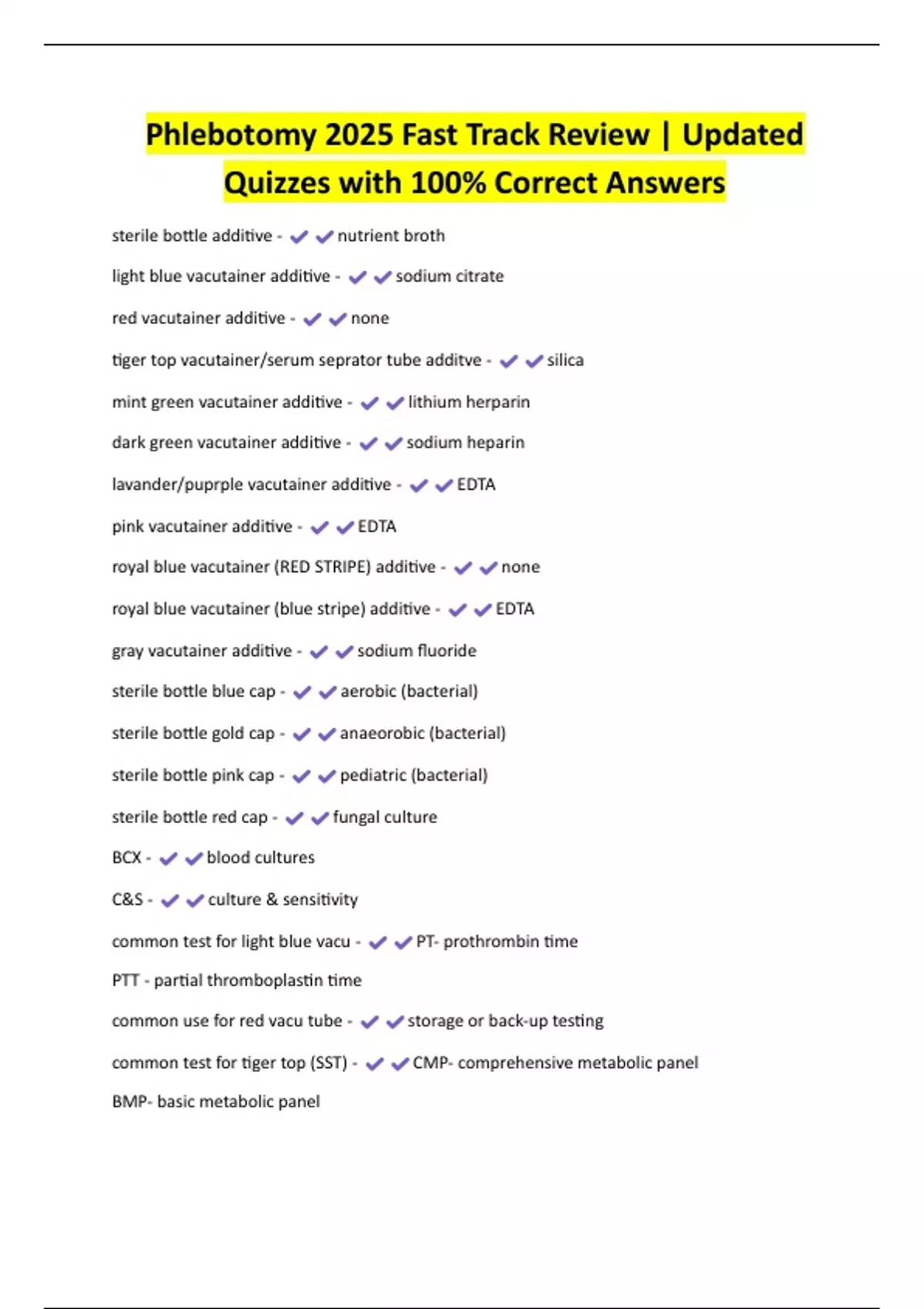 Phlebotomy 2025 Fast Track Review | Updated Quizzes with 100% Correct Answers