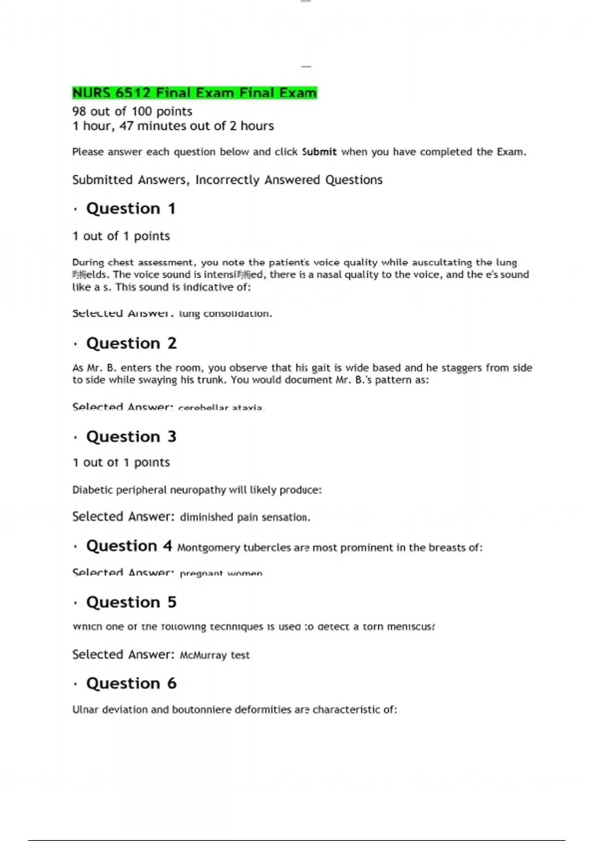 • Question 1 1 out of 1 points During chest assessment, you note the patient's voice quality while auscultating the lung 昀椀elds. The voice sound is intensi昀椀ed, there is a nasal quality to the voice, and the e's sound like a s. This sound is indicative of: Selected Answer: lung consolidation. • Question 2 As Mr. B. enters the room, you observe that his gait is wide based and he staggers from side to side while swaying his trunk. You would document Mr. B.'s pattern as: Selected Answer: cerebellar ataxia. • Question 3 1 out of 1 points Diabetic peripheral neuropathy will likely produce: Selected Answer: diminished pain sensation. • Question 4 Montgomery tubercles are most prominent in the breasts of: Selected Answer: pregnant women. • Question 5 Which one of the following techniques is used to detect a torn meniscus? Selected Answer: McMurray test • Question 6 Ulnar deviation and boutonniere deformities are characteristic of: lOMoARcPSD| Selected Answer: rheumatoid arthritis. • Question 7 A pulsation that is diminished to the point of being barely palpable would be graded as: Selected Answer: 1 • Question 8 In the most effective percussion technique of the posterior lung 昀椀elds, the patient cooperates by: Selected Answer: folding the arms in front. Question 9 When palpating joints, crepitus may occur when: Selected Answer: irregular bony surfaces rub together. • Question 10 While collecting personal and social history data from a woman complaining of breast discomfort, you should question her regarding: Selected Answer: alcohol, tobacco, and caffeine use. • Question 11 Postural hypotension is de昀椀ned as a when the patient stands, compared with sitting or supine readings. Selected Answer: systolic pressure drop of more than 15 mm Hg with a pulse rate increase • Question 12 You are examining a patient in the emergency department who has recently sustained head trauma. In order to initially assess this patient's neurologic status, you would: Selected Answer: test the six cardinal points of gaze. • Question 13 lOMoARcPSD| Temporalis and masseter muscles are evaluated by: Selected Answer: having the patient clench his or her teeth. • Question 14 A parent is advised to restrict contact or collision sports participation for their child. An example of a sport in which this child could participate is: Selected Answer: ri昀氀ery. • Question 15 Cranial nerve XII may be assessed in an infant by: Selected Answer: observing the infant suck and swallow. • Question 16 The reliability of health-related 昀椀ndings and observations is the responsibility of the: Selected Answer: professional and the patient. • Question 17 Normal changes of the aging brain include: Selected Answer: diminished perception of touch. • Question 18 The adnexa of the uterus are composed of the: Selected Answer: fallopian tubes and ovaries. • Question 19 For purposes of examination and communication of physical 昀椀ndings, the breast is divided into: Selected Answer: four quadrants plus a tail. • Question 20 A patient in the deepest coma would be scored a on the Glasgow Coma Scale. Selected Answer: 3 lOMoARcPSD| • Question 21 A patient you are seeing in the emergency department for chest pain is suspected of having a myocardial infarction. During the health history interview of his family history, he relates that his father had died of "heart trouble." The most important follow-up question you should pose is which of the following? Selected Answer: "What age was your father at the time of his death?" • Question 22 Nerves that arise from the brain rather than the spinal cord are called: Selected Answer: cranial. • Question 23 While examining a 30-year-old woman, you note that one breast is slightly larger than the other. In response to this 昀椀nding, you should: Selected Answer: note the 昀椀nding in the patient’s record. • Question 24 In the adult, the apical impulse should be most visible when the patient is in what position? Selected Answer: Upright • Question 25 A 23-year-old white woman has come to the clinic because she has missed two menstrual periods. She states that her breasts have enlarged and that her nipples have turned a darker color. Your further response to this 昀椀nding is to: Selected Answer: suggest pregnancy testing. • Question 26 Tarry black stool should make you suspect: Selected Answer: upper intestinal bleeding. • Question 27 To assess spinal levels L2, L3, and L4, which deep tendon re昀氀ex should be tested? lOMoARcPSD| Selected Answer: Patellar • Question 28 You are conducting an examination of Mr. Curtis’s heart and blood vessels and auscultate a grade III murmur. The intensity of this murmur is: Selected Answer: moderately loud. • Question 29 To assess a cremasteric re昀氀ex, the examiner strokes the: Selected Answer: inner thigh and observes whether the testicle and scrotum rise on the stroked side. • Question 30 An examiner has rotated a brush several times into the cervical os. The brush was withdrawn and stroked lightly on a glass slide. The slide was sprayed with 昀椀xative. Which type of specimen requires this technique for collection? Selected Answer: Cytology smear • Question 31 Functional assessment is most important during the examination of a(n): Selected Answer: older adult. • Question 32 To spread the breast tissue evenly over the chest wall, you should ask the woman to lie supine with: Selected Answer: one arm overhead and a pillow under her shoulder. • Question 33 Part of the screening orthopedic component of the examination includes evaluating the person while he or she is: Selected Answer: duck walking. • Question 34 When is the mental status portion of the neurologic system examination performed? lOMoARcPSD| Selected Answer: Constantly, throughout the entire interaction with a patient • Question 35 If a patient cannot shrug the shoulders against resistance, which cranial nerve (CN) r