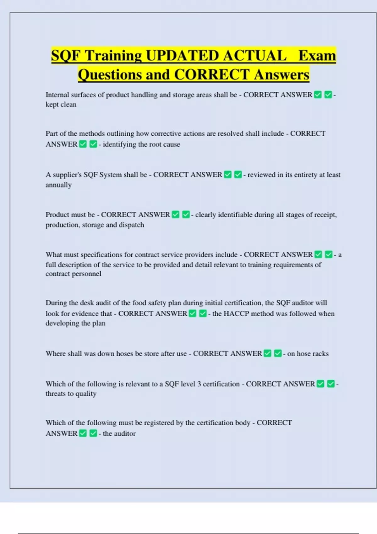 SQF Training UPDATED ACTUAL Exam Questions and CORRECT Answers Internal surfaces of product handling and storage areas shall be - CORRECT ANSWER kept clean Part of the methods outlining how corrective actions are resolved shall include - CORRECT ANSWER - identifying the root cause A supplier's SQF System shall be - CORRECT ANSWER - - reviewed in its entirety at least annually Product must be - CORRECT ANSWER production, storage and dispatch - clearly identifiable during all stages of recei