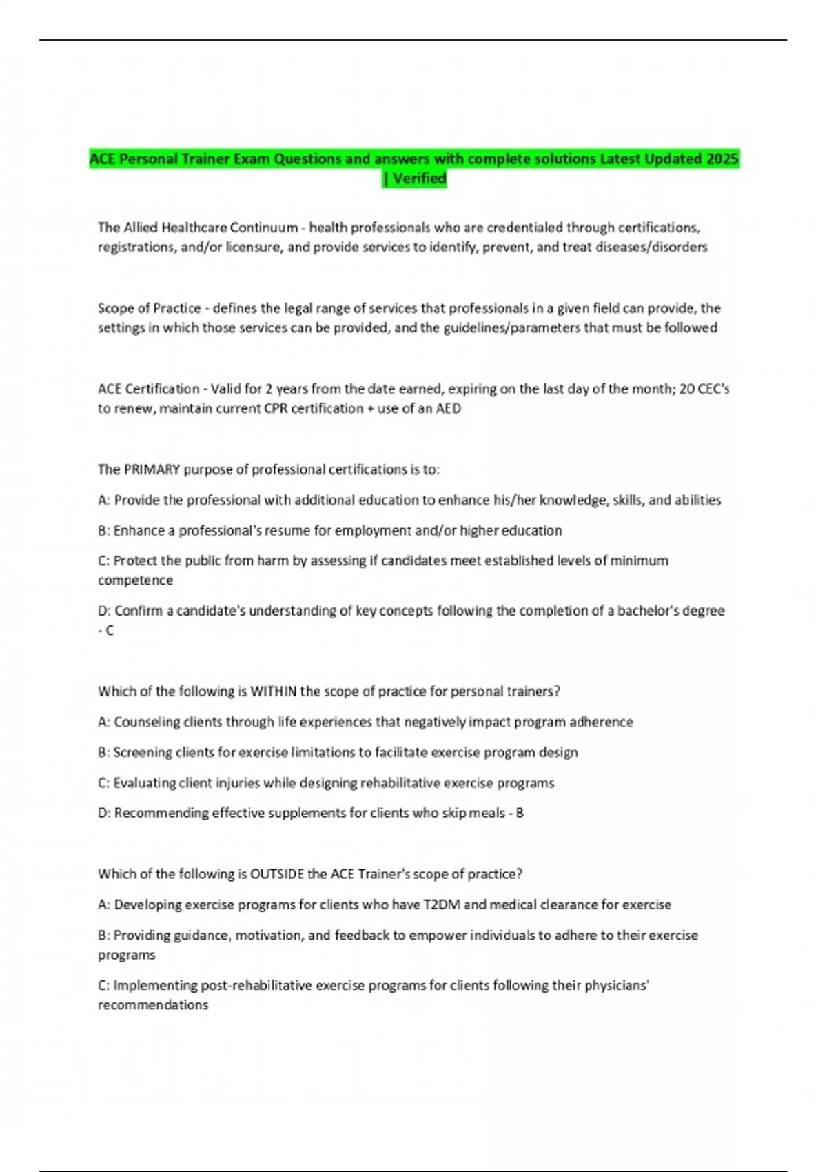 ACE Personal Trainer Exam Questions and answers with complete solutions Latest Updated 2025 | Verified