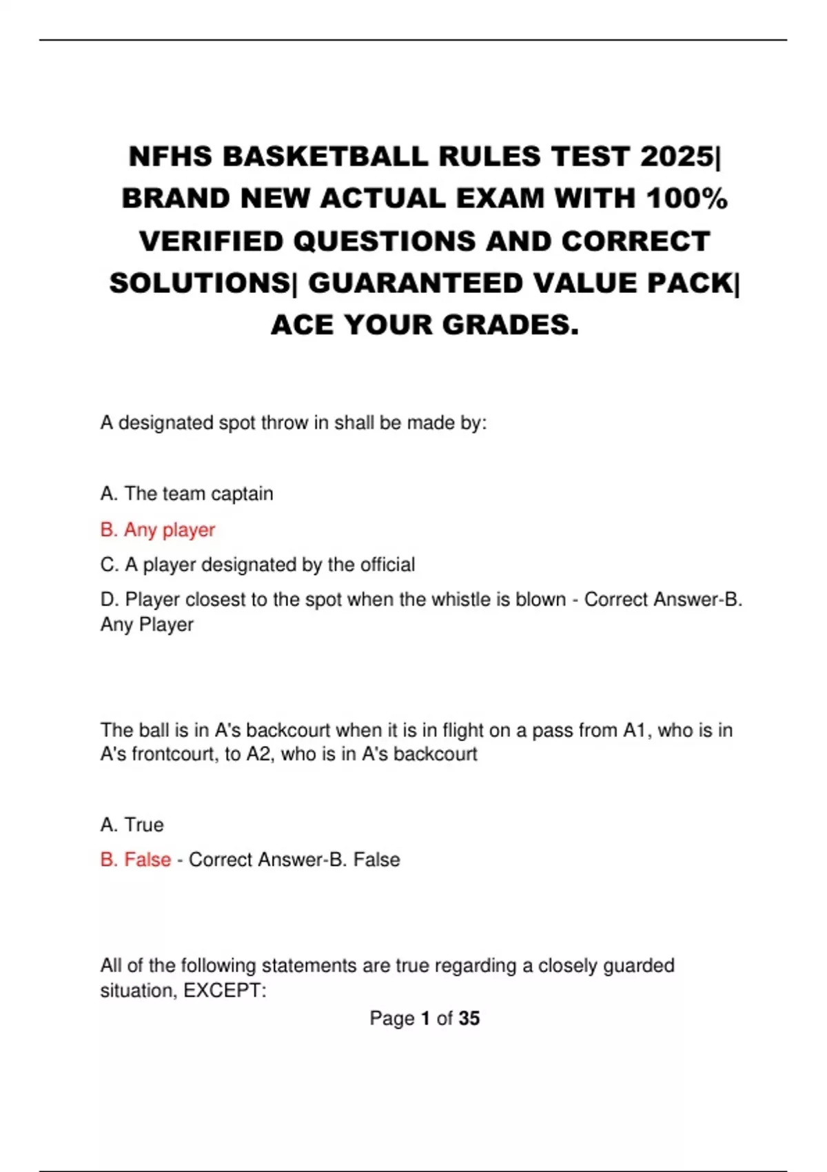 NFHS BASKETBALL RULES TEST 2025| BRAND NEW ACTUAL EXAM WITH 100% VERIFIED QUESTIONS AND CORRECT SOLUTIONS| GUARANTEED VALUE PACK| ACE YOUR GRADES. A designated spot throw in shall be made by: A. The team captain B. Any player C. A player designated by the official D. Player closest to the spot when the whistle is blown - Correct Answer-B. Any Player The ball is in A's backcourt when it is in flight on a pass from A1, who is in A's frontcourt, to A2, who is in A's backcourt A. True B. False - Correct Answer-B. False All of the following statements are true regarding a closely guarded situation, EXCEPT:Page 2 of 35 A. A closely guarded count continues during an interrupted dribble B. A closely guarded count only takes place in a team's frontcourt C. A violation occurs when a dribbling player is closely guarded for five seconds D. The closely guarded distance is measured from the forward foot/feet of the defender to the forward foot/feet of the ball handler - Correct Answer-A. A closely guarded count continues during an interrupted dribble Team A is awarded an alternating possession throw in. The arrow will be switched toward Team B in all of the following EXCEPT: A. After A1's throw in pass is touched by A2 B. After Team A commits a throw in violation C. When a foul is committed by either team before the throw in ends D. After A1's throw in pass is touched by B2 E. After A1's throw in pass is touched by A2, who is standing on a boundary line - Correct Answer-C. When a foul is committed by either team before the throw in ends During a dribble from backcourt to frontcourt, the ball is in A's frontcourt if one of the dribbler's feet, A1, is on the division line and the other foot and the ball are touching on A's frontcourt. A. True B. False - Correct Answer-B. FalsePage 3 of 35 Traveling is moving a foot in any direction in excess of prescribed limits while holding the ball. Which of the following statements is also true? A. A player who catches the ball with both feet on the floor may pivot using either foot B. On a catch with both feet on the floor, when one is lifted, the other becomes the pivot C. The pivot foot may be lifted before the ball is released to start a dribble D. All of the above - Correct Answer-D. All of the above On a throw in, the ball becomes live when: A. The ball is touched B. The ball is at the thrower's disposal C. The ball is possessed D. All of the above - Correct Answer-B. The ball is at the thrower's disposal If A1's try or tap is legally touch