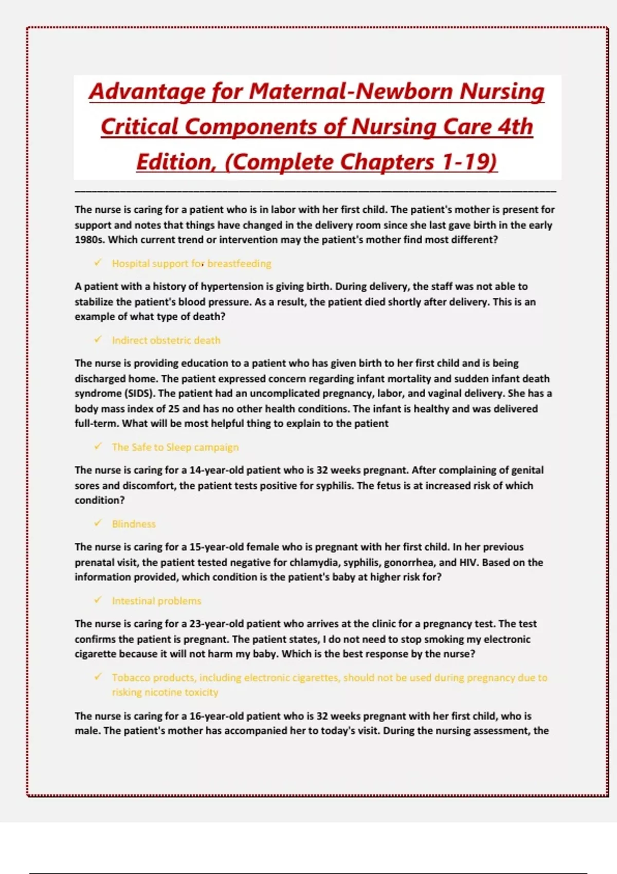 Advantage for Maternal-Newborn Nursing Critical Components of Nursing Care 4th Edition, (Complete Chapters 1-19)