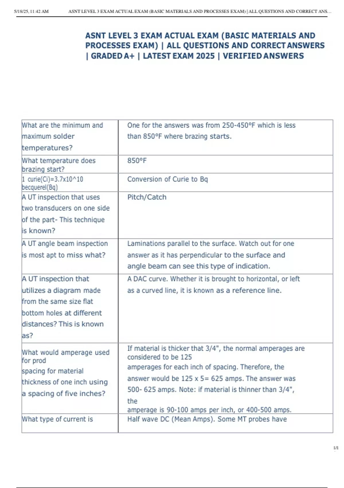 5/18/25, 11:42 AM ASNT LEVEL 3 EXAM ACTUAL EXAM (BASIC MATERIALS AND PROCESSES EXAM) | ALL QUESTIONS AND CORRECT ANS…