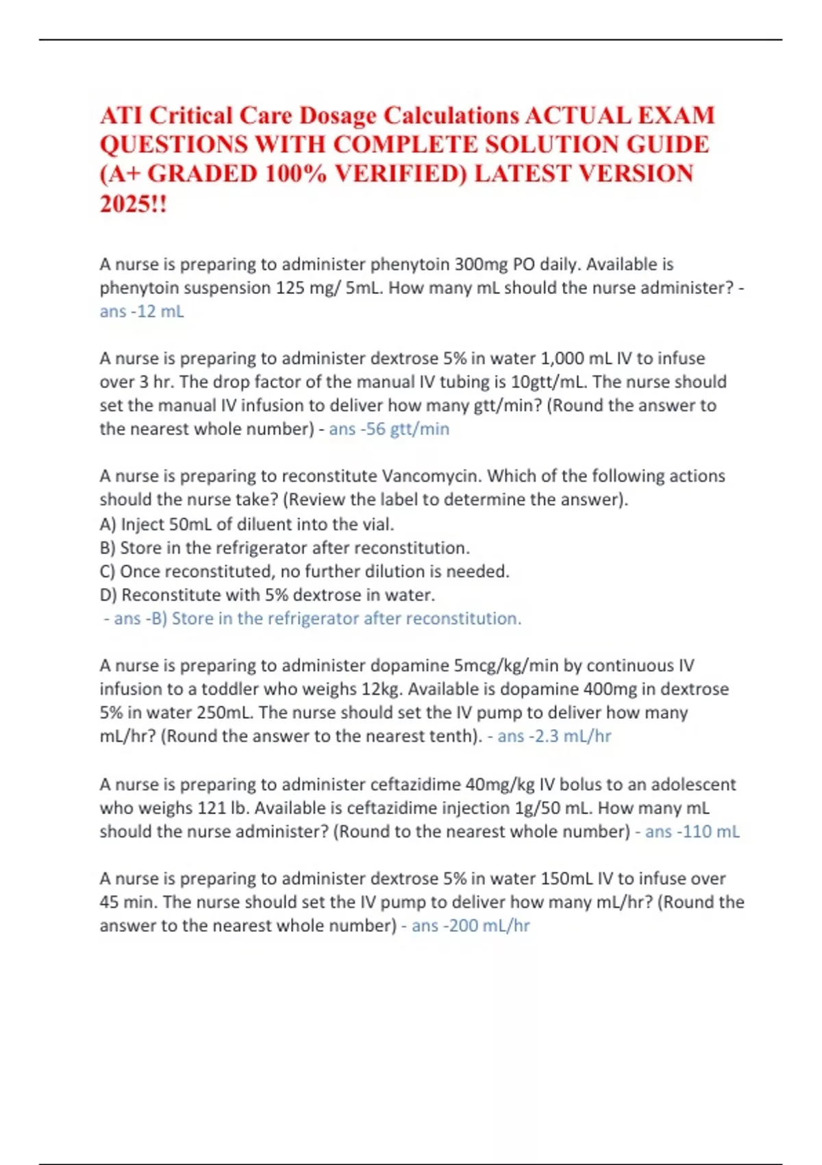 ATI Critical Care Dosage Calculations ACTUAL EXAM QUESTIONS WITH COMPLETE SOLUTION GUIDE (A+ GRADED 100% VERIFIED) LATEST VERSION 2025!!