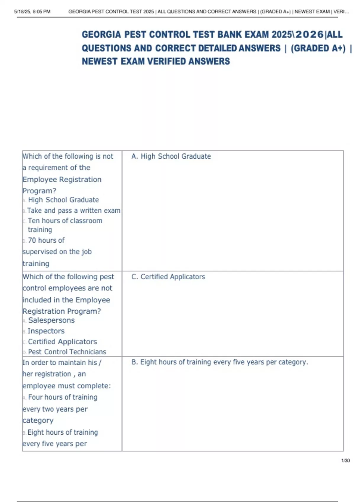, 5/18/25, 8:05 PM GEORGIA PEST CONTROL TEST 2025 | ALL QUESTIONS AND CORRECT ANSWERS | (GRADED A+) | NEWEST EXAM | VERI…