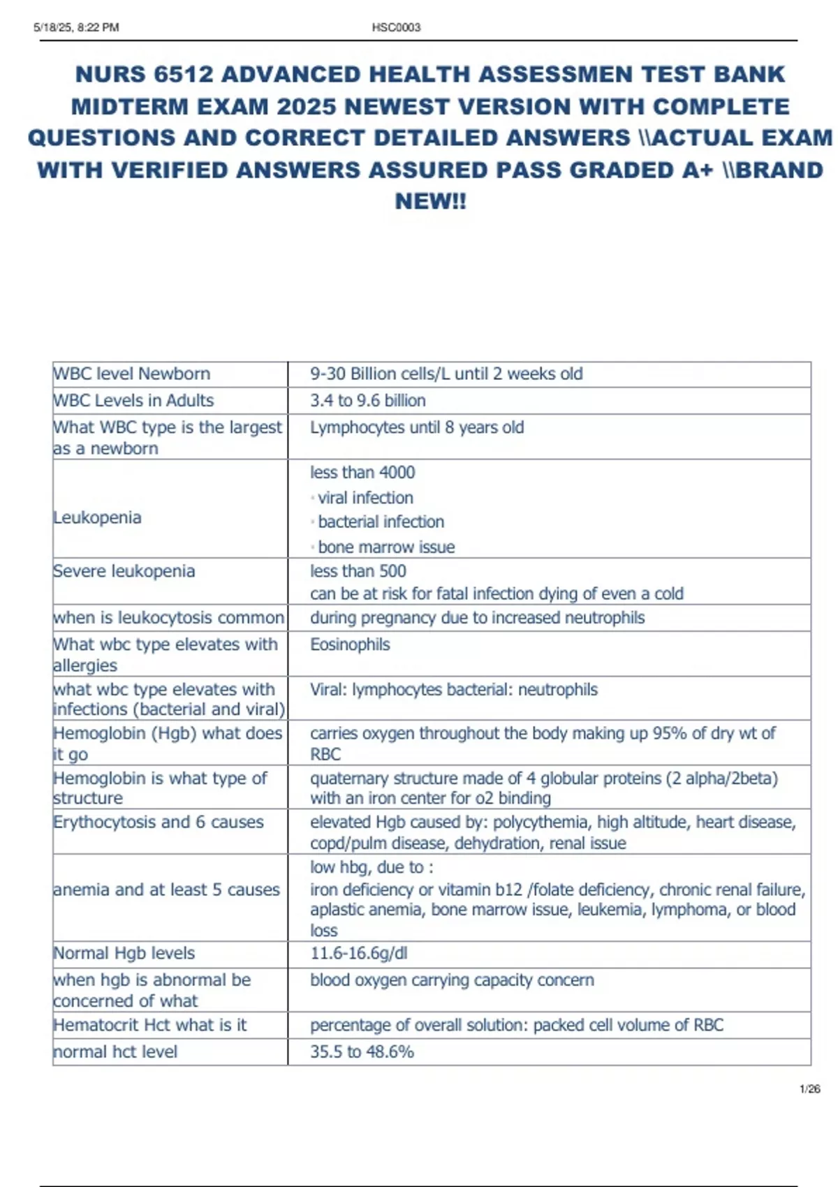NURS 6512 ADVANCED HEALTH ASSESSMEN TEST BANK