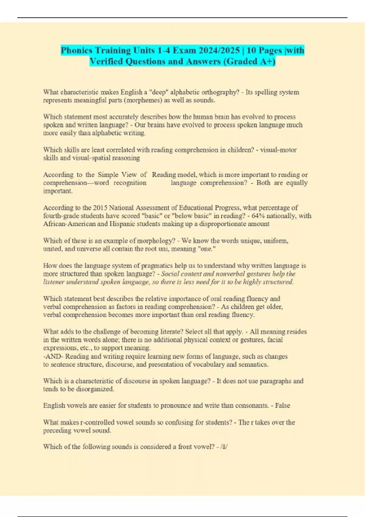 Phonics Training Units 1-4 Exam 2024/2025 | 10 Pages |with Verified Questions and Answers (Graded A+)