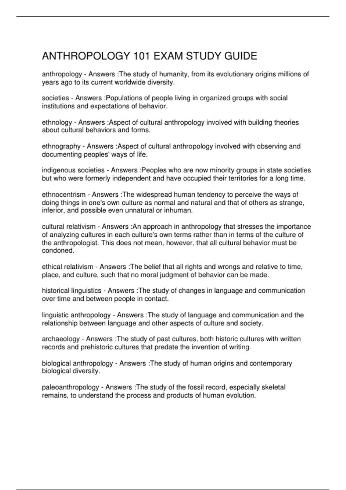 ANTHROPOLOGY 101 EXAM STUDY GUIDE