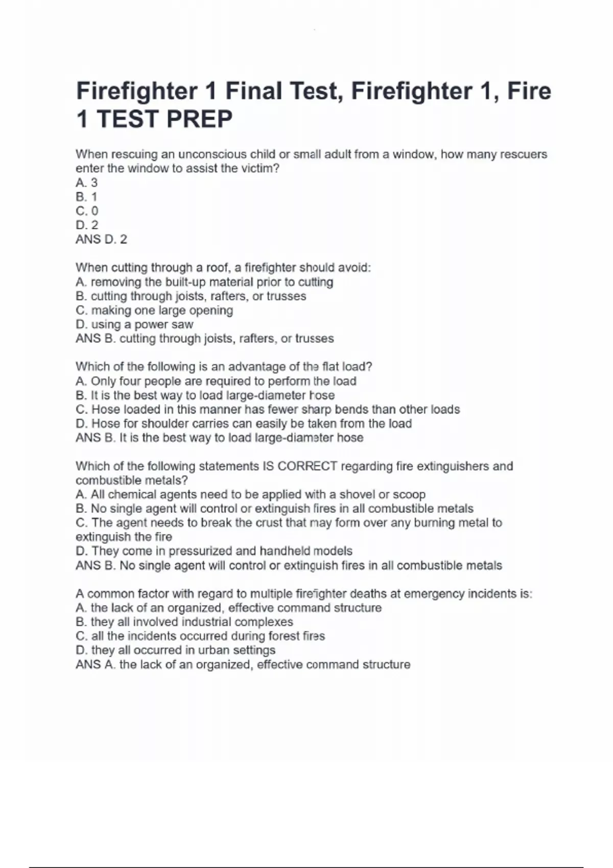 Firefighter 1 Final Test, Firefighter 1, Fire 1 TEST PREP When rescuing an unconscious child or small adult from a window, how many rescuers enter the window to assist the victim? A. 3 B. 1 C. 0 D. 2 ANS D. 2 When cutting through a roof, a firefighter should avoid: A. removing the built-up material prior to cutting B. cutting through joists, rafters, or trusses C. making one large opening D. using a power saw ANS B. cutting through joists, rafters, or trusses Which of the following is an advantage of the flat load? A. Only four people are required to perform the load B. It is the best way to load large-diameter hose C. Hose loaded in this manner has fewer sharp bends than other loads D. Hose for shoulder carries can easily be taken from the load ANS B. It is the best way to load large-diameter hose Which of the following statements IS CORRECT regarding fire extinguishers and combustible metals? A. All chemical agents need to be applied with a shovel or scoop B. No single agent will control or extinguish fires in all combustible metals C. The agent needs to break the crust that may form over any burning metal to extinguish the fire D. They come in pressurized and handheld models ANS B. No single agent will control or extinguish fires in all combustible metals