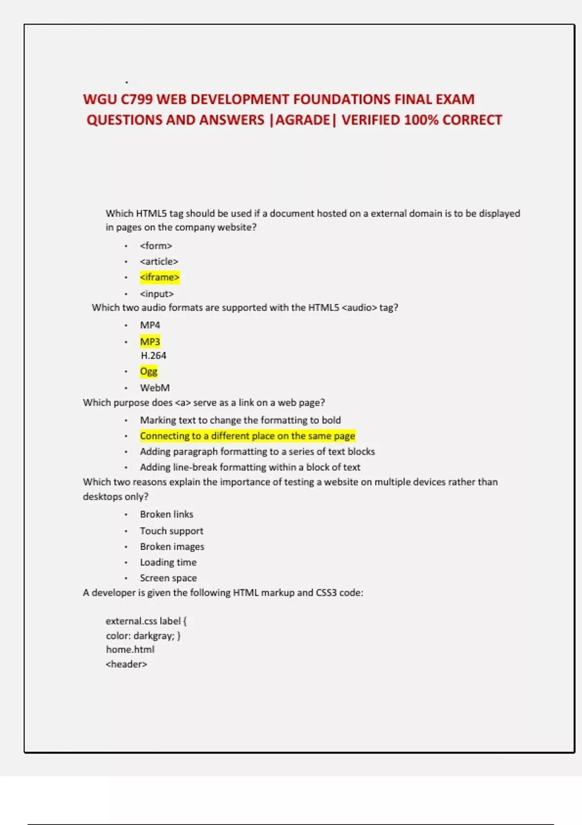 WGU C799 WEB DEVELOPMENT FOUNDATIONS FINAL EXAM QUESTIONS AND ANSWERS |AGRADE| VERIFIED 100% CORRECT
