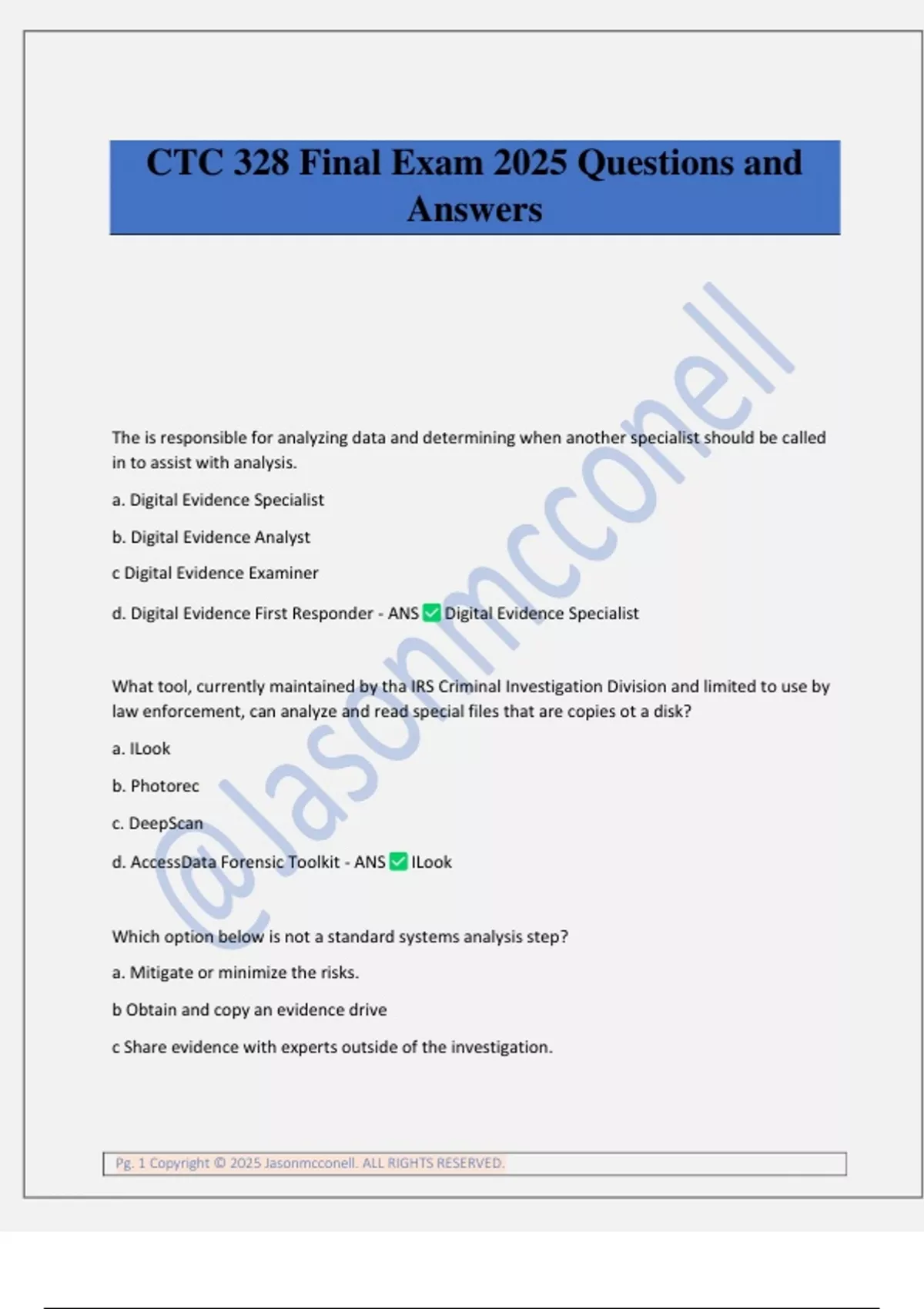 CTC 328 Final Exam 2025 Questions and Answers The is responsible for analyzing data and determining when another specialist should be called in to assist with analysis. a. Digital Evidence Specialist b. Digital Evidence Analyst c Digital Evidence Examiner d. Digital Evidence First Responder - ANS Digital Evidence Specialist What tool, currently maintained by tha IRS Criminal Investigation Division and limited to use by law enforcement, can analyze and read special files that are copies ot a disk? a. ILook b. Photorec c. DeepScan d. AccessData Forensic Toolkit - ANS ILook Which option below is not a standard systems analysis step? a. Mitigate or minimize the risks. b Obtain and copy an evidence drive c Share evidence with experts outside of the investigation. Pg. 2 Copyright © 2025 Jasonmcconell. ALL RIGHTS RESERVED. d. Determine a preliminary design or approach to the case. - ANS Share evidence with experts outside of the investigation. A chain-of-evidence form, which is used to document what has and has not been done with the original evidence and forensic copies of the evidence, is also known as a(n) Answers: a. evidence tracking form b. evidence custody form c single-evidence form d. multi-evidence form - ANS evidence custody form All suspected industrial espionage cases should be treated as civil case investigations. True or False - ANS false must be Included in an affidavit to support an allegation in order to justify a warrant Answers: a. Exhibits b. Witnesses c. Verdicts d. Subpoenas - ANS exhibits Within a computing investigation, the ability to perform a series of steps again and again to produce the same results IS known as a. verifiable reporting b repeatable findings c. reloadable steps Pg. 3 Copyright © 2025 Jasonmcconell. ALL RIGHTS RESERVED. d evidence repofiing - ANS repeatable findings Which amendment to the U.S. Constitution protects everyone's right to be secure in their person, residence, and property from search and seizure? a Fifth Amendment b Second Amendment C First Amendment d Fourth Amendment - ANS Fourth Amendment Most digital investigations in the private sector involve misuse of computing assets True False - ANS true The sale of sensitive or confidential company information to a competitor is known as a industrial betrayal b industrial espionage c industrial sabotage d industrial collusion - ANS industrial espionage Which option below i