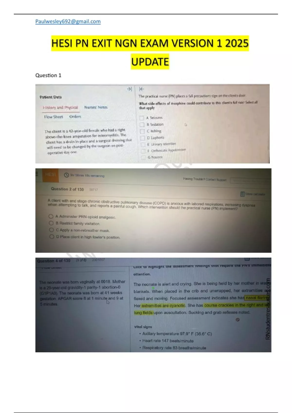 This document contains a complete collection of 130 practice questions and correct answers aligned with the 2025 Next Generation NCLEX (NGN) style for the HESI PN Exit Exam. It covers a wide range of essential nursing topics including medication safety, lab value interpretation, emergency procedures, chronic condition management, and client education. This version is ideal for practical nursing students preparing for final assessments and is structured to simulate the real NGN exam format.