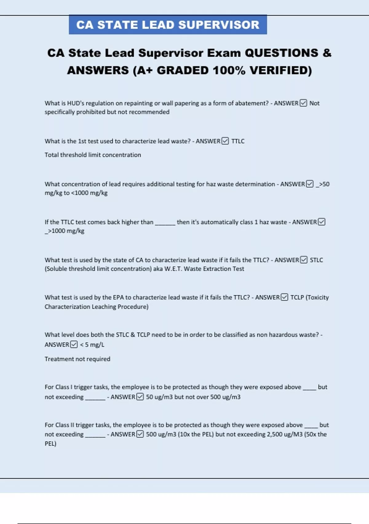 What test is used by the EPA to characterize lead waste if it fails the TTLC? - ANSWER✅ TCLP (Toxicity