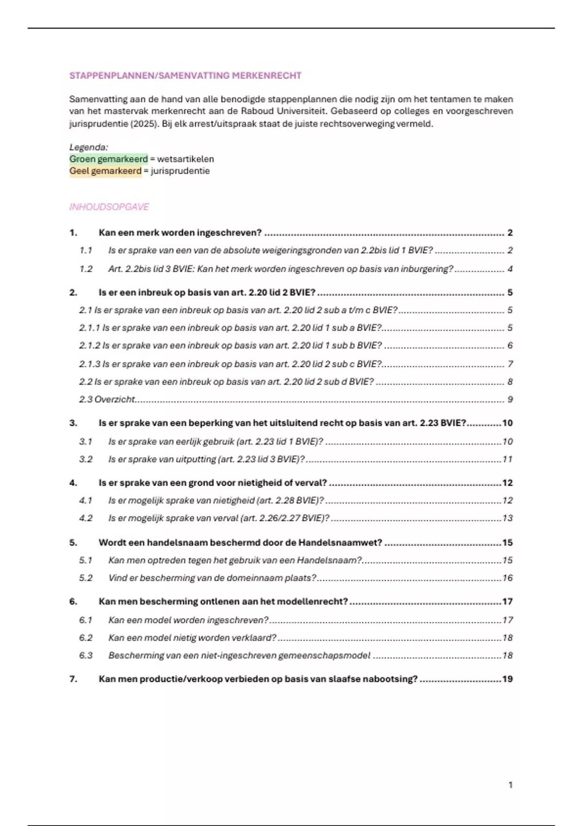 Stappenplan/samenvatting voor het mastervak merkenrecht aan de Radboud Universiteit. In de stappenplannen staat alle benodigde jurisprudentie met de juiste rechtsoverweging vermeld (lekker makkelijk met markeren).
