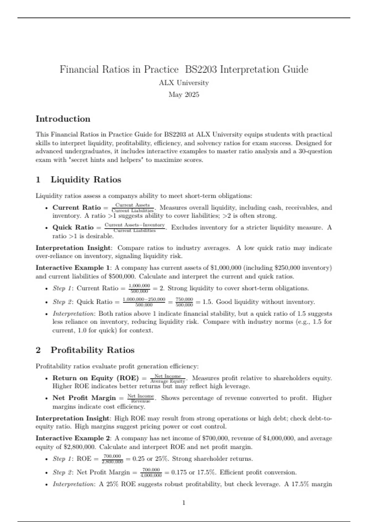 Financial Ratios in Practice BS2203 Interpretation Guide ALX University May 2025 Introduction This Financial Ratios in Practice Guide for BS2203 at ALX University equips students with practical skills to interpret liquidity, profitability, efficiency, and solvency ratios for exam success. Designed for advanced undergraduates, it includes interactive examples to master ratio analysis and a 30-question exam with "secret hints and helpers" to maximize scores.