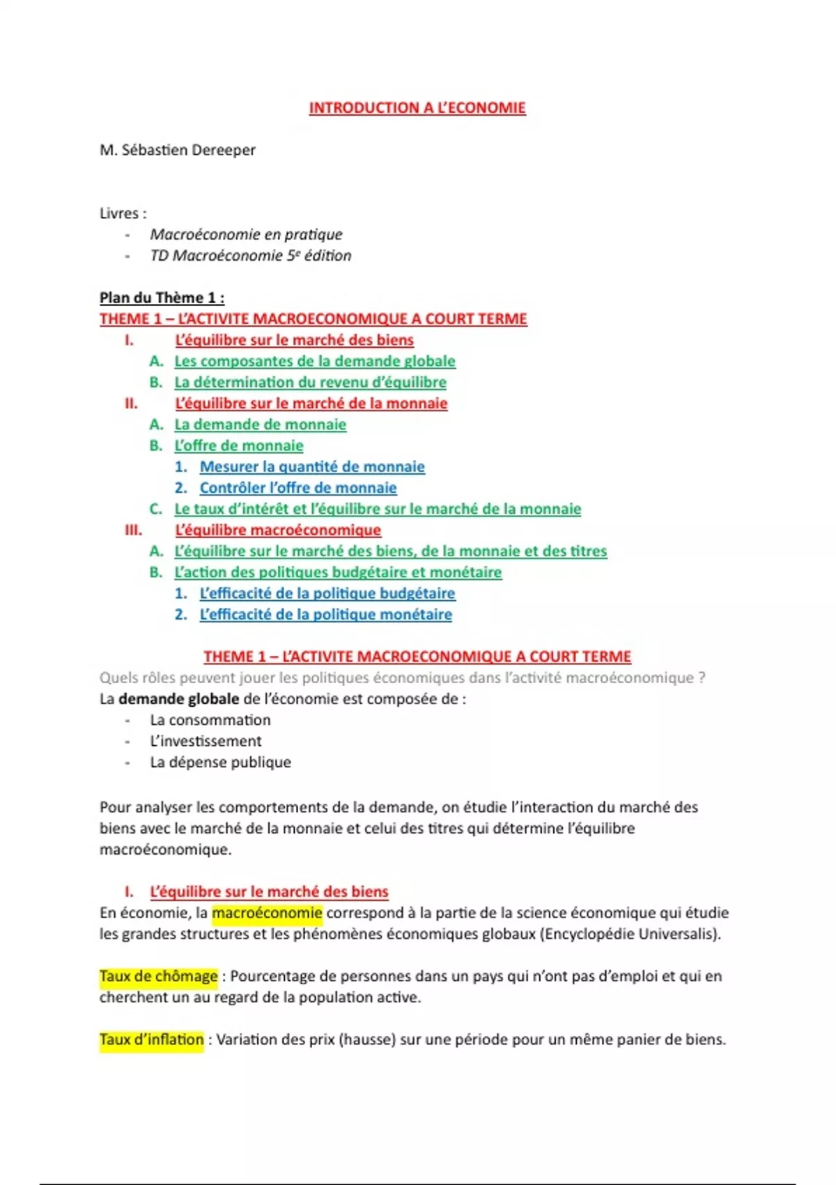 THEME 1 – L’ACTIVITE MACROECONOMIQUE A COURT TERME
