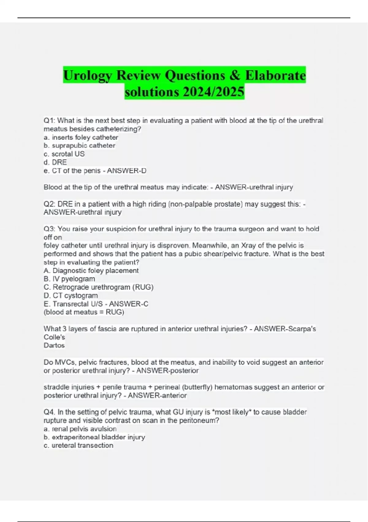 Urology Review Questions & Elaborate solutions 2024/2025 Q1: What is the next best step in evaluating a patient with blood at the tip of the urethral meatus besides catheterizing? a. inserts foley catheter b. suprapubic catheter c. scrotal US d. DRE e. CT of the penis - ANSWER-D Blood at the tip of the urethral meatus may indicate: - ANSWER-urethral injury Q2: DRE in a patient with a high riding (non-palpable prostate) may suggest this: - ANSWER-urethral injury Q3: You raise your suspicion for urethral injury to the trauma surgeon and want to hold off on foley catheter until urethral injury is disproven. Meanwhile, an Xray of the pelvic is performed and shows that the patient has a pubic shear/pelvic fracture. What is the best step in evaluating the patient? A. Diagnostic foley placement B. IV pyelogram C. Retrograde urethrogram (RUG) D. CT cystogram E. Transrectal U/S - ANSWER-C (blood at meatus = RUG) What 3 layers of fascia are ruptured in anterior urethral injuries? - ANSWER-Scarpa's Colle's Dartos Do MVCs, pelvic fractures, blood at the meatus, and inability to void suggest an anterior or posterior urethral injury? - ANSWER-posterior straddle injuries + penile trauma + perineal (butterfly) hematomas suggest an anterior or posterior urethral injury? - ANSWER-anterior Q4. In the setting of pelvic trauma, what GU injury is *most likely* to cause bladder rupture and visible contrast on scan in the peritoneum? a. renal pelvis avulsion b. extraperitoneal bladder injury c. ureteral transection d. intraperitoneal bladder injury e. urethral injury - ANSWER-D (full bladder = you will see contrast in the peritoneum) (extraperitoneum = NO contrast in peritoneum, the white stuff/contrast will be around and below the bladder) Q5. These happens when you have a *full bladder at the time of trauma*: a. renal pelvis avulsion b. extraperitoneal bladder injury c. ureteral transection d. intraperitoneal bladder injury e. urethral injury - ANSWER-D Q6. These happens when you have an* empty/compressed bladder at the time of trauma*: a. renal pelvis avulsion b. extraperitoneal bladder injury c. ureteral transection d. intraperitoneal bladder injury e. urethral injury - ANSWER-B (*e*empty = *e*extraperitoneal) How should an intraperitoneal bladder injury be managed? - ANSWER-surgery (immediate cystography) + foley catheter for 2 weeks How should an extraperitoneal bladder injury be managed? - ANSWER-catheter for 2 weeks Difference in tx from intraperitoneal and extraperitoneal bladder injury? - ANSWER-instar = surgery + catheter extra = just catheter Q7. A 45-year-old male presents to the emergency room with scrotal pain and swelling for one week, but worsening over the past 24 hours. He has a PMH significant for uncontrolled DM. He is ill appearing. Temperature is 102.4. WBC is 28. Glucose is 427. Physical exam revealed on the following slide. Severely erythematous, necrotic appearing scrotum and perineum. Crepitus in upper thighs, scrotum, escutcheon. Extremely foul odor emanating from wound. What disease process is illustrated? a. Cellulitis b. Rectal perforation c. Fournier's Gangrene d. Hernia e. Spider Bite - ANSWER-C How do we treat Fournier's Gangrene? - ANSWER-broad spectrum abx aggressive debridement strict blood glucose control delayed wound closure and skin grafting Q8. A 40-year-old male with history of erectile dysfunction treated with Viagra (sildenafil) presents with a painful, persistent erection for the previous 18 hours. What is the next step? a. cold compress b. alpha-blocker therapy c. beta-blocker therapy d. aspiration + drainage of erection e. tourniquet - ANSWER-d Continues...