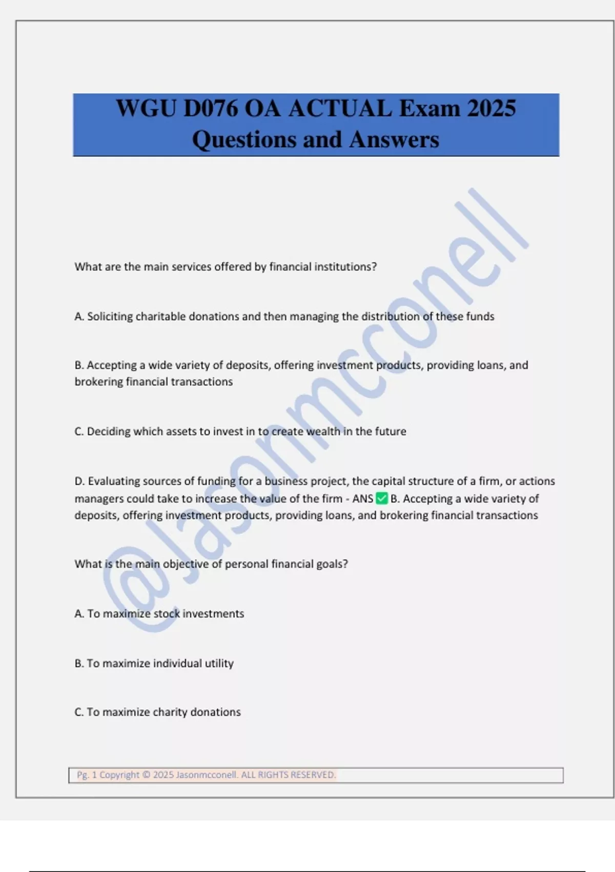 WGU D076 OA ACTUAL Exam 2025 Questions and Answers What are the main services offered by financial institutions? A. Soliciting charitable donations and then managing the distribution of these funds B. Accepting a wide variety of deposits, offering investment products, providing loans, and brokering financial transactions C. Deciding which assets to invest in to create wealth in the future D. Evaluating sources of funding for a business project, the capital structure of a firm, or actions managers could take to increase the value of the firm - ANS B. Accepting a wide variety of deposits, offering investment products, providing loans, and brokering financial transactions What is the main objective of personal financial goals? A. To maximize stock investments B. To maximize individual utility C. To maximize charity donations Pg. 2 Copyright © 2025 Jasonmcconell. ALL RIGHTS RESERVED. D. To maximize owner wealth - ANS B. To maximize individual utility Which task does the financial manager of a firm perform that involves the issuance of new stocks and bonds? A. Making financing decisions B. Managing working capital C. Deciding on accounting standards D. Making investing decisions - ANS A. Making financing decisions Why is understanding the definition of finance important in managing personal finances? A. It helps individuals compare the costs and benefits of an action to determine whether to take that action. B. It helps individuals act ethically with regard to finances. C.It helps individuals understand legal issues related to finance. D. It allows individuals to find an investment with the highest return possible. - ANS A. It helps individuals compare the costs and benefits of an action to determine whether to take that action. In which type of market would a company issue bonds or stocks for the first time? Pg. 3 Copyright © 2025 Jasonmcconell. ALL RIGHTS RESERVED. Dealer market Primary market Secondary market Money market - ANS Primary market Which type of financial institution is a mutual fund? Contractual institution Depository institution Investment institution Federal institution - ANS Investment institution Which financial institution specializes in managing and administering retirement funds? Investment banks Mutual funds Pension funds Private equity - ANS Pension funds