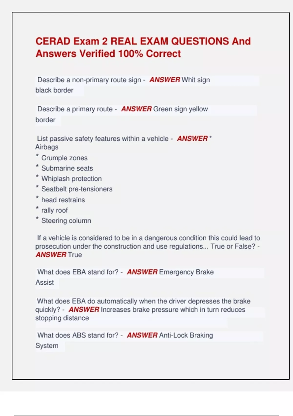 List passive safety features within a vehicle - ANSWER *
