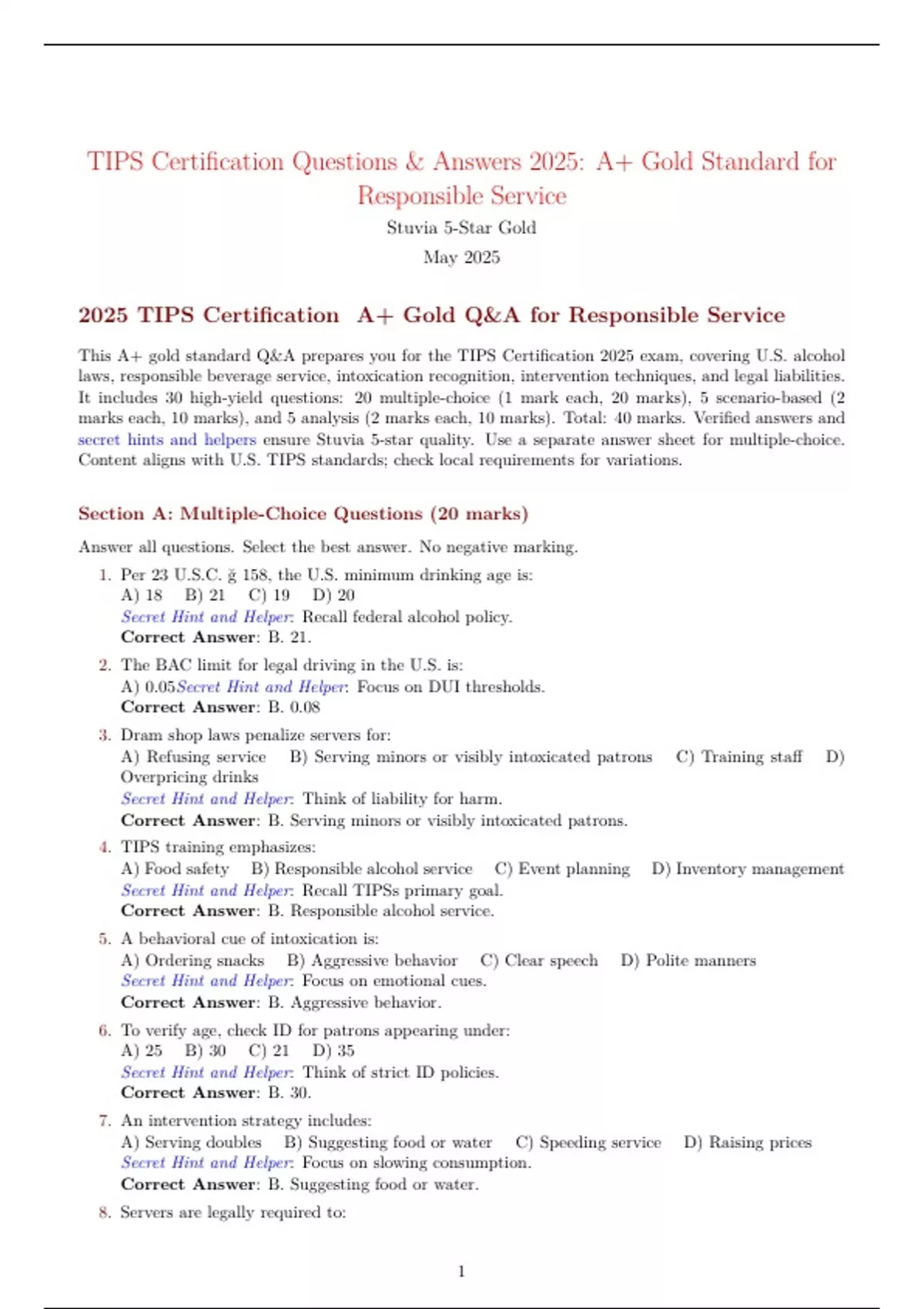 This A+ gold standard Q&A prepares you for the TIPS Certification 2025 exam, covering U.S. alcohol