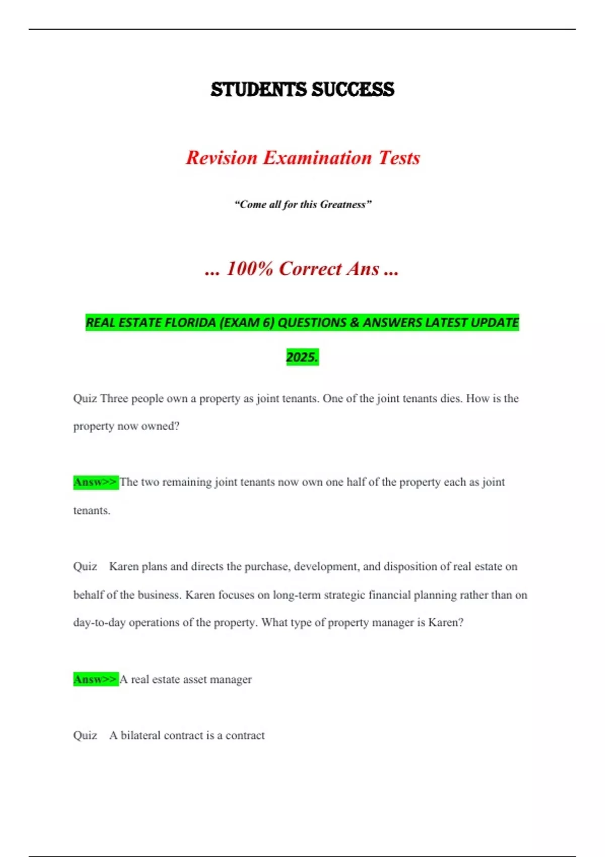 REAL ESTATE FLORIDA (EXAM 6) QUESTIONS & ANSWERS LATEST UPDATE 2025. REAL ESTATE FLORIDA (EXAM 6) QUESTIONS & ANSWERS LATEST UPDATE 2025.
