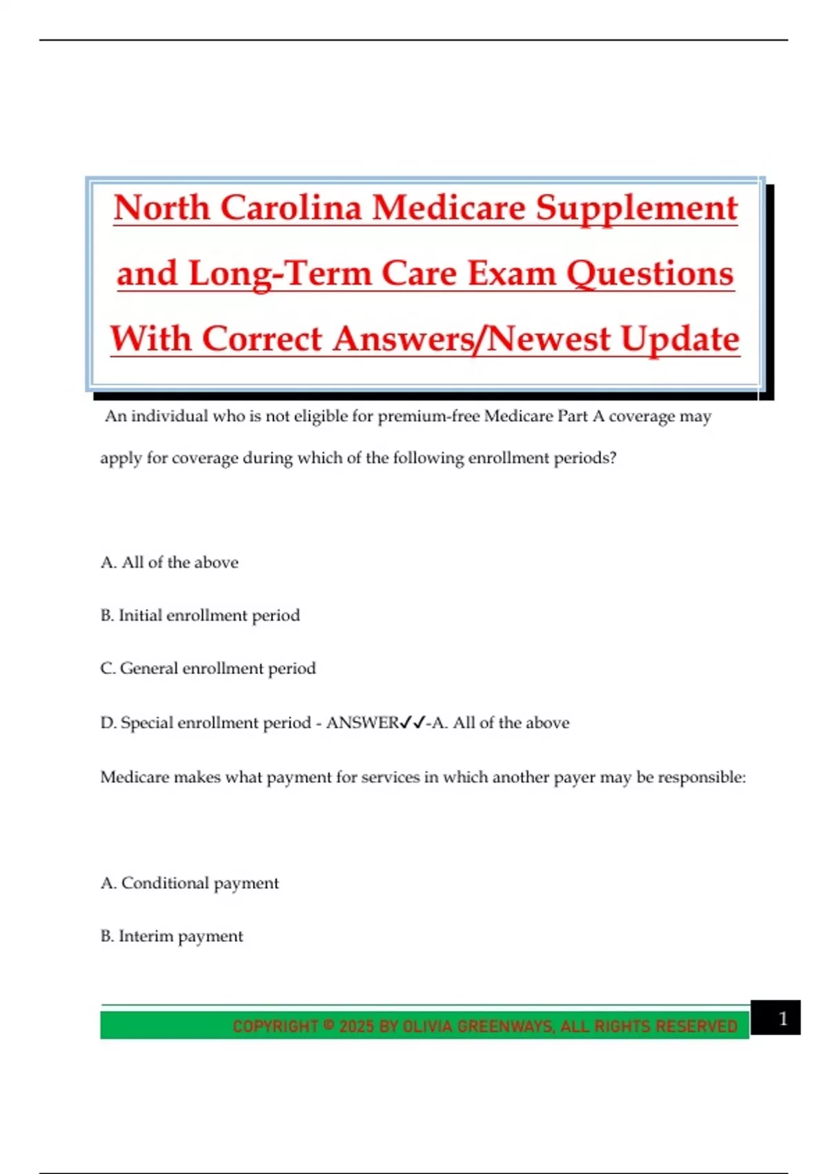 North Carolina Medicare Supplement and Long-Term Care Exam Questions With Correct Answers/Newest Update